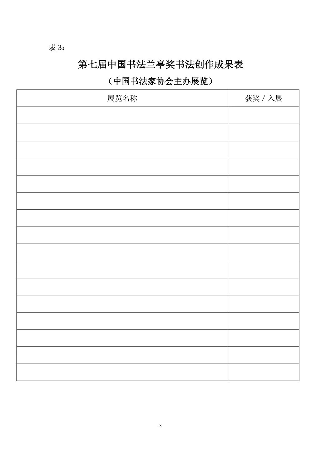 中国书法兰亭奖是中国文学艺术界联合会、中国书法家协会共同主办的中国书法艺术专业奖,每届评奖周期为三年。经研究,定于2020年9月启动第七届中国书法兰亭奖。现将有关征稿事项公告如下: 主 办:中国文学艺术界联合会 中国书法家协会 联合主办:绍兴市人民政府 浙江省文学艺术界联合会 承 办:中国文联书法艺术中心 浙江省书法家协会 中共绍兴市委宣传部 绍兴市文化旅游集团 二、组织机构 1、组委会 第七届中国书法兰亭奖组委会由主办、承办单位有关领导共同组成,负责兰亭奖的组织领导工作。 2、评奖委员会 依据《第七届中国书法兰亭奖评奖委员会产生管理办法》,组成评奖委员会,评奖委员会设评审委员会、审议委员会、监审委员会、观察委员会,负责评审、审议、监审、观察工作。 三、活动宗旨 第七届中国书法兰亭奖以习近平新时代中国特色社会主义思想和党的十九大精神为指导,坚持“二为”方向和“双百”方针,以植根传统、鼓励创新、艺文兼备、多样包容为评审原则,把握正确的评奖导向,承续中华文化,陶铸时代书风,充分展现中国书法艺术博大而深厚的人文精神,不断提升兰亭奖的专业性、示范性、引领性。通过推出优秀人才和精品力作,发挥评奖机制的激励作用,引导书家坚守艺术理想,增强文化自信,勇攀书法艺术高峰,为推动中华优秀传统文化创造性转化、创新性发展谱写新时代的华彩篇章。 本届兰亭奖将突出德艺双馨、人书合一的评价标准,把创作水平作为评奖的重要标尺的同时,还将综合关注、考量投稿作者的文化素养、艺术积累、创新意识、品德操守以及对书法艺术和社会所作出的贡献与成就。 四、奖项设置及评审标准 依据全国性文艺评奖制度改革的意见和《全国性文艺评奖改革方案》《中国文联全国性文艺评奖管理办法》的规定,第七届中国书法兰亭奖设: 1、金银铜奖:20名 金奖:5名,其中书法创作方向4名,理论研究方向1名。 银奖:7名,其中书法创作方向5名,理论研究方向2名。 铜奖:8名,其中书法创作方向6名,理论研究方向2名。 书法创作获奖:结合投稿作者历年来尤其是近三年的创作成果,着重审评其创作水平与实力,综合考量投稿作者的文化素养、艺术积累、创新意识和对当代书坛的贡献与影响,以及在书法创作以外的书法各领域所取得的综合成就和个人品德评价。 理论研究获奖:结合投稿作者历年来尤其是近三年的理论研究成果,着重审评其理论研究水平与实力,综合考量投稿作者的研究水准、理论功底和对当代书坛的贡献与影响,以及在书法研究以外的书法各领域所取得的综合成就和个人品德评价。 2、入选:50名,其中书法创作方向40名,理论研究方向10名。 书法创作入选:着重审评投稿作者的创作水平,参考其历年来尤其是近三年所取得的创作成果,考察其文化素养、道德品行、艺术才情与发展潜力。 理论研究入选:着重审评投稿作者的理论研究水平,参考其历年来尤其是近三年所取得的研究成果,考察其道德品行、研究水准与发展潜力。 五、投稿、申报 1、参评范围 中国书法家协会会员。 2、申报方式 (1)个人参评:下载填写报名表格,连同个人参评稿件、退稿费汇款单复印件、证明材料复印件寄至收稿地址。证明材料复印件包含身份证复印件、中国书法家协会会员证复印件(已批准入会尚未办理会员证者可作说明)以及表格内所填写成果的证明复印件(证书、书籍版权页、目录页等复印件)。 (2)集体推荐:由中国书法家协会各专业委员会和中国书法家协会各团体会员单位(省、直辖市、自治区、生产建设兵团及各产/行业书协)参照中国书法家协会有关集体推荐及报送方式的函件推荐作者。 3、申报材料要求及有关事项 (1)书法创作参评作品要求: ①每位投稿作者提交个人代表作3幅。其中两幅创作时间须为2018年至2020年,另一幅创作时间不限(请勿提交曾在前六届兰亭奖中获奖、入展作品或内容与形式相同的作品)。形式不限,可寄送已公开发表作品。 ②创作内容文体不限,可书写健康向上的古今诗文,追求真善美。3幅作品中须至少有1幅为自撰类作品。书写非自撰内容要注意使用权威版本,保持内容的准确连贯和相对完整。同时应在落款处写上原作者姓名及篇名。投稿作者须遵守《民法典》与《著作权法》等法律法规规定,确保书写内容不存在著作权、名誉权等争议和纠纷。因书写内容、形式而产生的纠纷,由投稿作者本人负责。 ③大幅作品不超过八尺整纸,小幅作品不小于一平尺。手卷作品尺寸高度不超过35cm,长度不超过248cm。册页作品尺寸每页高宽不超过40cm,页数不超过12开(24页)。 篆刻作品须寄印稿6—10方,附2个以上边款,统一贴在四尺对开的竖式宣纸上。 仅提交篆刻的投稿作者,篆刻作品寄印稿12-20方,附4个以上边款,分别贴在2张四尺对开的竖式宣纸上,另须提交1件篆书作品(内容为自撰)。 ④已轴装作品可原样寄送,框装作品可裁取作品软片寄送。新创作作品不需装裱。 ⑤为便于评审、装裱和展示,投稿作品应选择高质量专业书画用纸,避免使用易折断、破损的纸张。兰亭奖不接收非纸张类材料创作的书法作品(绢类除外)。 ⑥请在作品背面最下方用铅笔楷书注明:投稿作者真实姓名、性别、省份、身份证号、会员证号(已批准入会尚未办理会员证者可作说明)、常用通讯地址、邮编、联系电