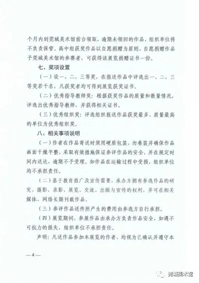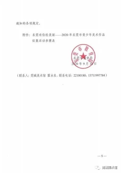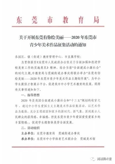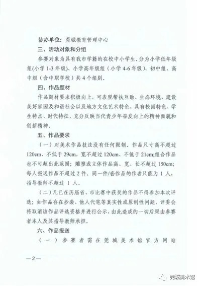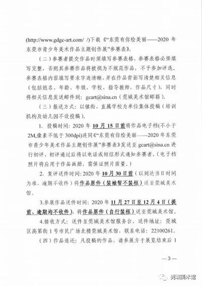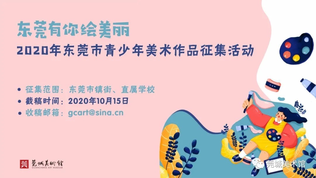 由东莞市教育局和莞城街道办事处主办、东莞市中小学体育艺术联合会和莞城美术馆承办、莞城教育管理中心协办的“东莞有你绘美丽一一2020年东莞市青少年美术作品征集活动”现已启动,欢迎同学们踊跃投稿哟。 (滑动以下组图查看:《关于开展东莞有你绘美丽一一2020年东莞市青少年美术作品征集活动的通知》) 征集要求 1、参赛对象 具有我市学籍的在校中小学生 。分为小学低年级组(小学 1-3 年级)、小学高年级组 ( 小学 4-6 年级 )、初中组 、高中组 (含中职学校 ) 共 4 个组别。 2、作品题材 要求积极向上,可表现帮扶互助、生态环境、建设美好家园、和谐社会以及地方文化艺术特色,具有校园特色、学生特点、时代特征,充分反映当代青少年奋发向上的精神面貌和创新精神 。 3、作品要求 必须为个人原创;凡已在历届省、市比赛中获奖的作品不得参加本次评选;对美术作品的技法没有任何限制。 作品尺寸:高不超过120cm、不低于29cm,宽不超过120cm、不低于21cm,组合作品也不可超过此范围;雕塑或立体作品高、宽、长皆不可超过150cm。 每人送报作品不超过2件,同一件/套作品的作者只能为一人,指导教师不超过一人。 4、作品报送 以镇街、直属学校为单位集体投稿(培训机构及幼儿园不设投稿)。 参赛者需在点击 “阅读原文” 下载 《东莞有你绘美丽一一2020年东莞市青少年美术作品征集活动参赛表》并完整填写,然后连同参赛作品(电子档)一同发至邮箱gcart@sina. cn参与初评;若通过初评,将以电话或短信形式通知参赛者。 作品电子档不小于2M,像素不低于300dpi(电子档照片将应用于作品画册,需保证照片质量)。 奖项设置 1、设一 、二、三 等奖 在报送作品中评选出一 、二 、三 等奖若干名。凡获奖者均可得到展览获奖证书。 2、优秀指导教师奖 根据获奖作品的质量和数量情况,评选出优秀指导教师,并获得相关证书。 3、优秀组织奖 评选组织报送作品获奖最多 、质量最高的单位为优秀组织奖。 截稿时间 2020年10月15日 “东莞有你绘美丽”展览品牌,自2009年由莞城美术馆创立,今年将是举行第六届展览。 (“2018东莞有你绘美丽一一东莞市中小学师生水墨作品展”展厅) 同学们,挥动手中的画笔吧, 一起绘出我们美丽的大东莞!