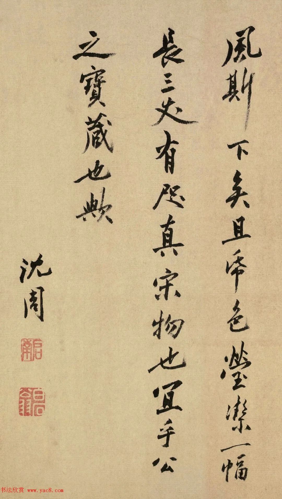 沈周(1427—1509),字启南,号石田,晚号白石翁,长洲(今江苏苏州)人。沈周的书法起步于家传,初以学赵孟頫、苏轼体为主;至晚年更倾心学黄庭坚。喜用狼毫挥书,线条锋利铦锐,结构跌宕开阖,中宫收紧而四维开张,所谓“长撇大捺”,遒劲奇崛,也是明代的书法名家。与文徵明、唐寅、仇英并称“吴门四家”。