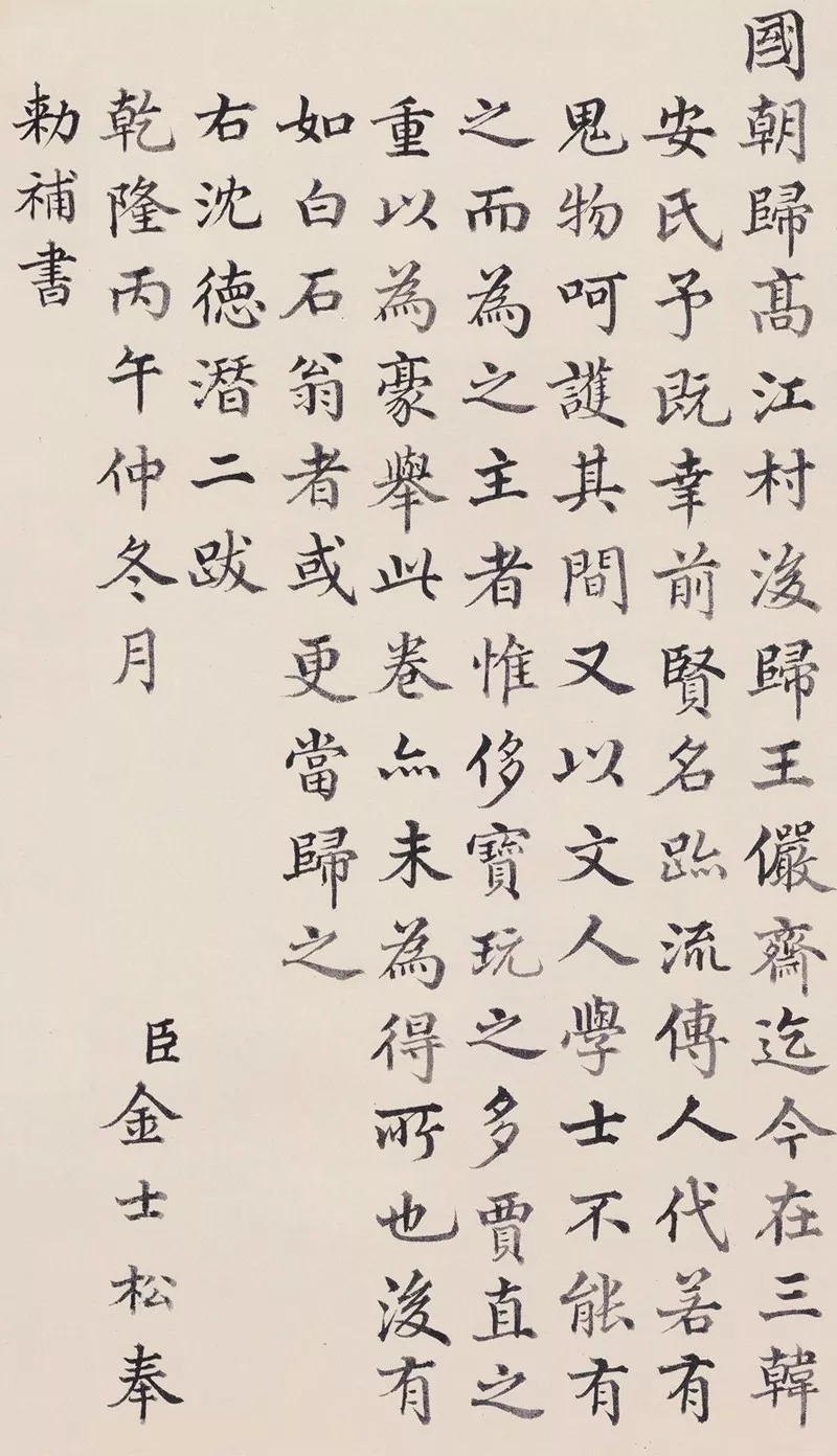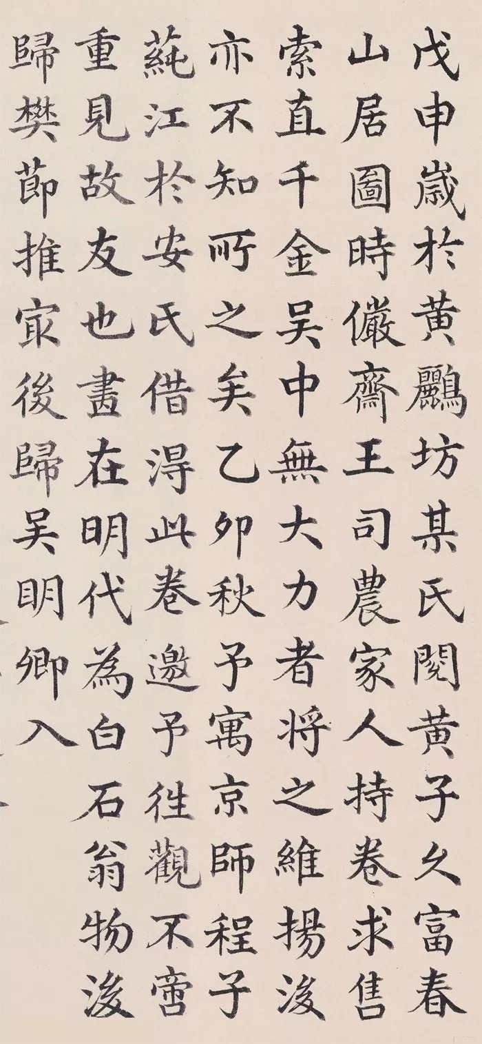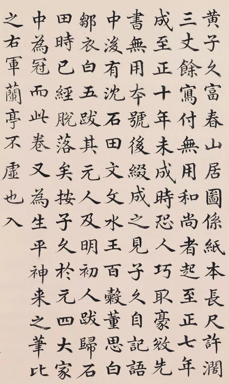金士松楷书《跋黄公望富春山居图卷》,纸本,台北故宫博物院藏。此帖出于颜体,结体端庄秀美,笔意潇洒灵动,于飘逸中见稳妥,于典雅中见遒劲,不失为楷书精品之作。