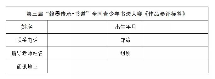 附件一:第三届“翰墨传承•书道”全国青少年书法大赛《作品参评标签》