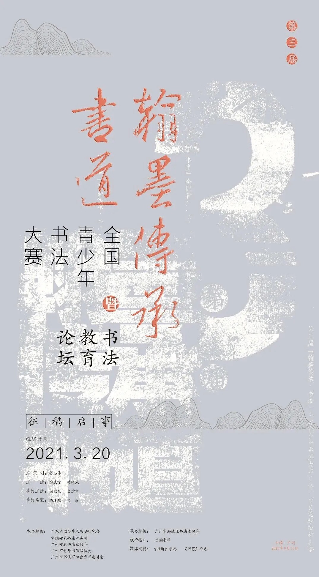 为进一步加强中华民族优秀传统文化教育,提高青少年汉字书写水平,感受汉字中的人文精神和道德意蕴,展示汉字的艺术魅力和时代风采。广东省国际华人书法研究会、中国硬笔书法江湖网、广州硬笔书法家协会、广州市青年书法家协会、广州市书法家协会青年委员会、广州市海珠区书法家协会联合举办“第三届‘翰墨传承•书道’全国青少年书法大赛暨书法教育论坛”,现征稿如下: