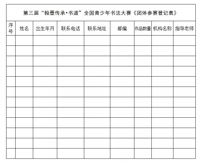 附件二:第三届“翰墨传承•书道”全国青少年书法大赛《团体参赛登记表》