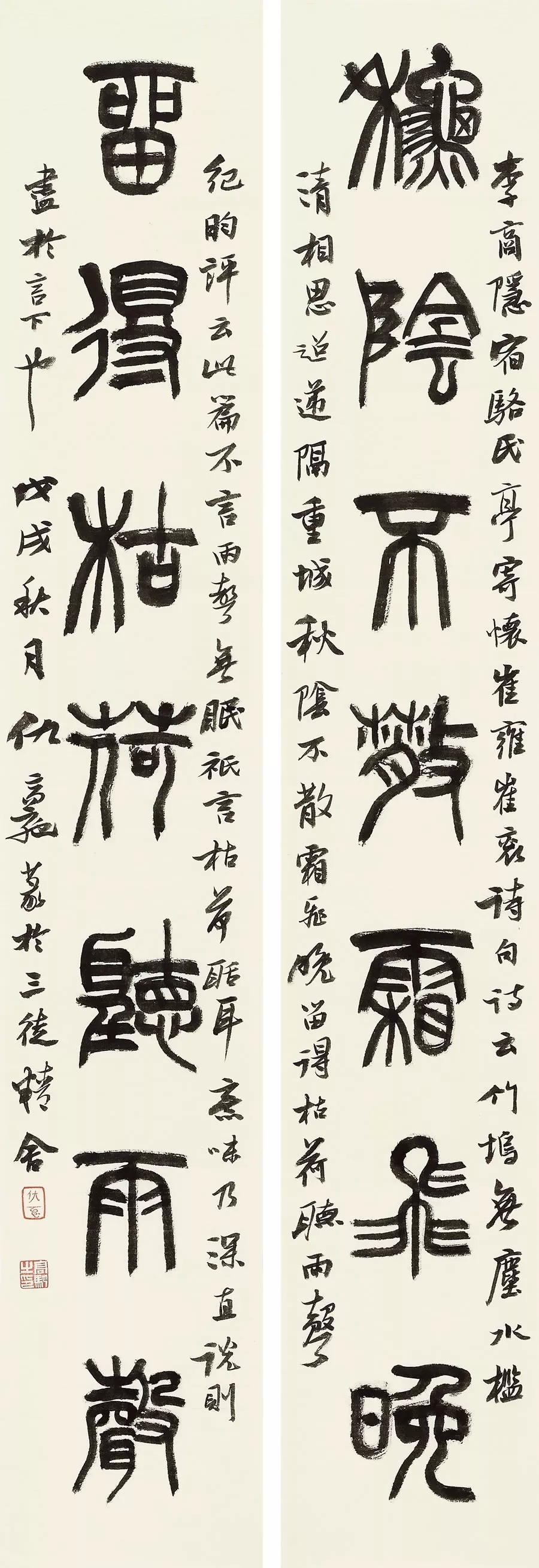 又称楹联。分为上下两联,右边的为上联,左边的为下联。上下联的尺寸可与条幅等同,也可大于或小于条幅。对联的书写内容规定极为严格,只能是对仗的句子(上下联字数相等,平仄相对、一般字不重复出现),包括对偶句(俗称对子)、律诗中的中间两联(颔联、颈联)。对偶句常见的有五言、七言,也有少到三字一联,多到数十字、上百字一联的。律诗则分为五言、七言两种。五言、七言的对联,在安排章法时,上下联应单行居中竖写。十字以上的对偶句,则宜写成双行或多行(注意书写顺序,上联从右向左,下联则从左向右。落双款,分别于上下联的未尾,款字略高于正文底端)。上下联字的位置一般要基本平行。处理好一联内上下字的大小、收放的变化,及上下两联间的呼应,令上下两联成为一个整体。