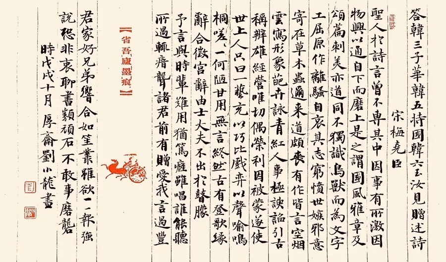 落款盖印之下,不可再题字,。印章上下有字掣肘,就失去自然现象。