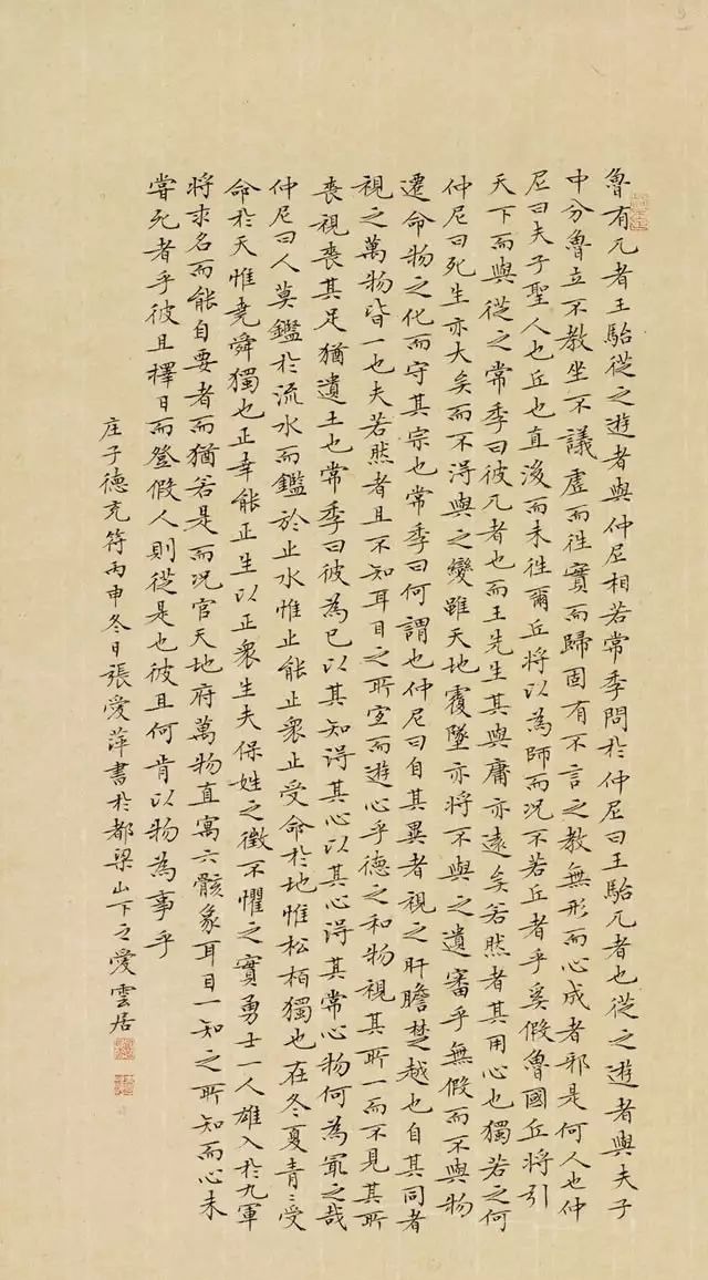 条幅是竖行书写的长条作品。尺寸一般为一张整宣纸对裁。安排章法时,应能根据书体的特点,精心构思,立意要新。在创作时,要注意正文与落款的主次关系,。落款要错落有致,自然生动。落款可写在末行正文的下方,布局时应留出余地。款的底端一般不以正文平齐,以避免形式的死板。也可在正文后面另占一行或两行,上下均不宜与正文平齐。印章要小于款字,盖印一般需离开一字以上位置,也可盖在款字左侧。