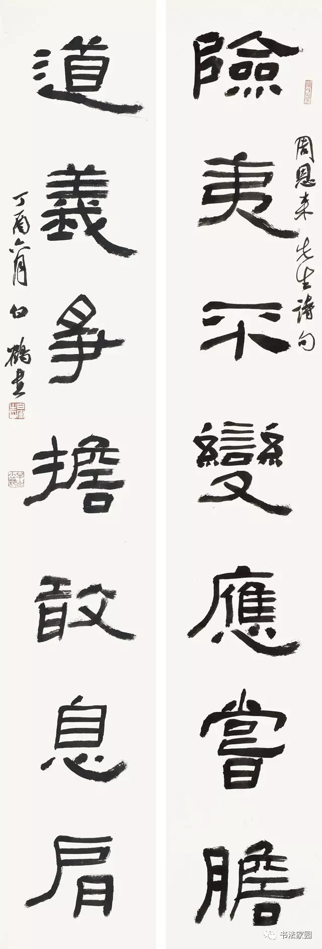 十字以下对联的落款分为上下款和单款两种。上下款,上款写在上联右边,下款写在下联左边。上款一般写诗句的作者、篇名等内容,如“黄庭坚登快阁诗句”下款则写书者的姓名、号,以及书写地点、时间等内容。如“丙子闲堂书于北京”若是赠送作品,上联需写明被赠者的名或号、称谓及雅正、惠存、清赏等字样。如“文英女士惠存”若是别人请你写的一幅作品,上联则写请你作书人的名或号,称谓外加上“嘱书”等字样。单款一般写在下联左侧中间偏上的位置。款字内容包括书写时间、作者的名号,也可只写作者名或号。印章盖在款字下方,一般以两方为宜,印与印之间要适当拉开距离。