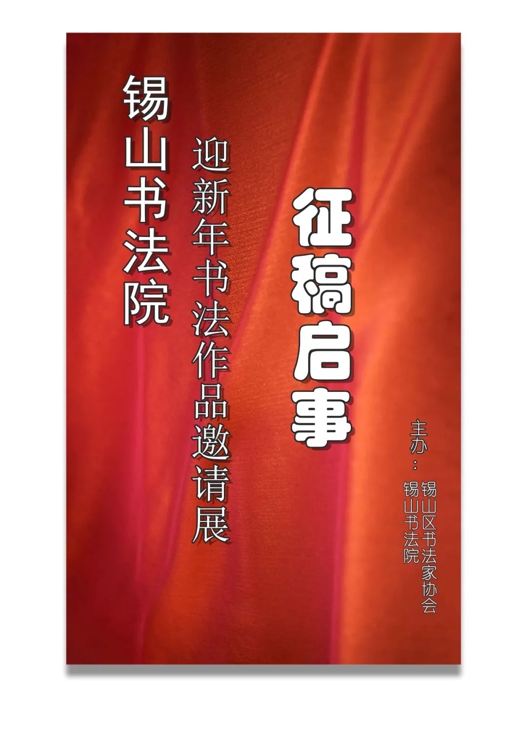 为全面展示锡山区优秀书法作者的整体水平,努力推出精品力作,推动锡山书法事业的繁荣发展。在锡山书法院建院九周年之际,特举办锡山书法院迎新年书法作品邀请展, 现将征稿事宜公布如下: