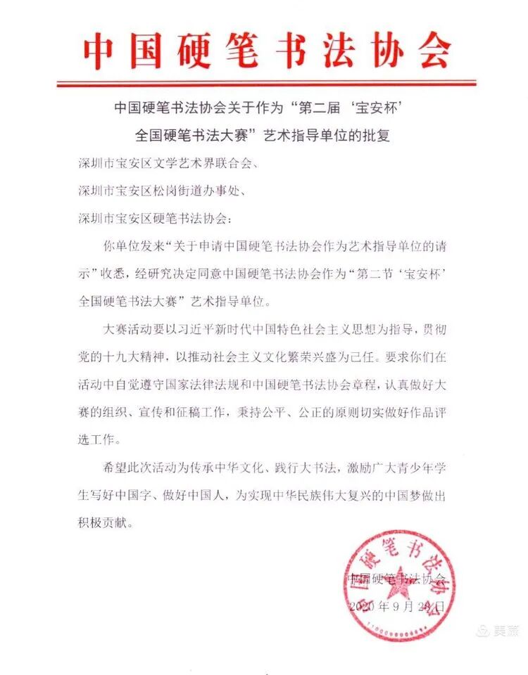 文艺是时代前进的号角。为坚定文化自信,传承初心之志,创造艺术之美,弘扬中国精神,推出精品,发掘人才,同时庆祝深圳经济特区在改革开放伟大进程中取得的丰硕成果,强化宝安文化在粤港澳大湾区和社会主义先行示范区建设中的驱动作用,以书法大赛与展览的形式扩大宝安文化在全国的影响力和知名度,推动文艺事业繁荣兴盛。经中国硬笔书法协会批准,现举办第二届“宝安杯”全国硬笔书法暨青少年规范汉字书写大赛,努力把此次大赛办成影响大、阵容强、水平高的艺术精品大赛。从即日起面向全国硬笔书法家、书法爱好者和青少年学生广泛征稿。