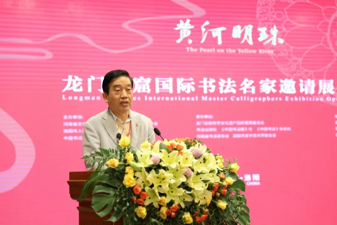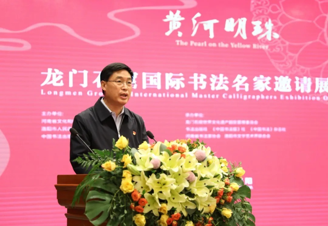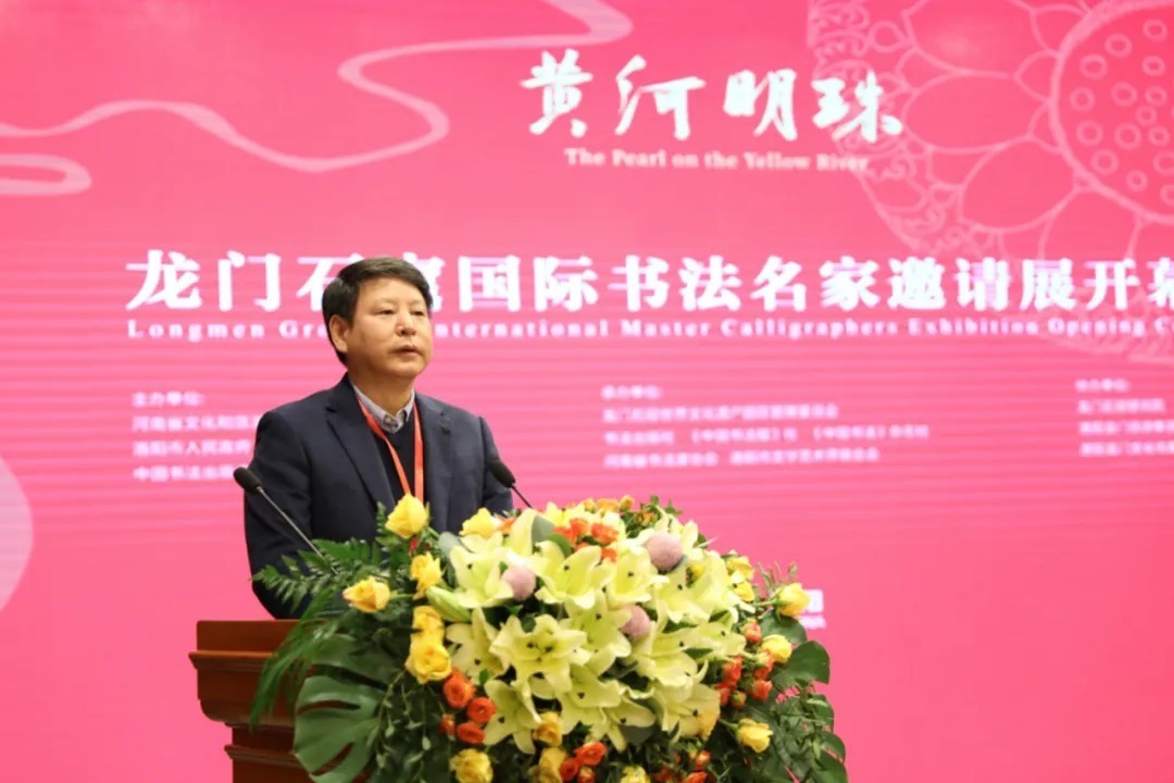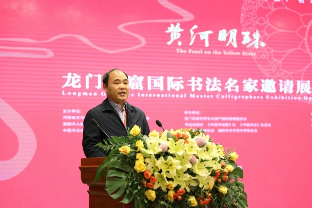 崔玉山在致辞中表示,河南是文化大省、书法大省、旅游大省,这些年来始终坚守文化阵地,在文化创作、文艺惠民、文旅融合上保持了良好的发展势头。在中国书法艺术正日益融入全球艺术行列、走上国际舞台的今天,传承龙门石窟深厚的文化资源和书法艺术是我们共同的使命。今天我们在此举行“龙门石窟国际书法名家邀请展”和“龙门书风学术讨论会”活动,就是要通过书法文化和书法艺术的传承交流,让文旅融合更加紧密,让中原文化更加出彩。龙门石窟作为河南省首个世界文化遗产,河南省文旅行业的一张亮丽名片,需要开展更多这样的活动,持续打造黄河文化的地标。
