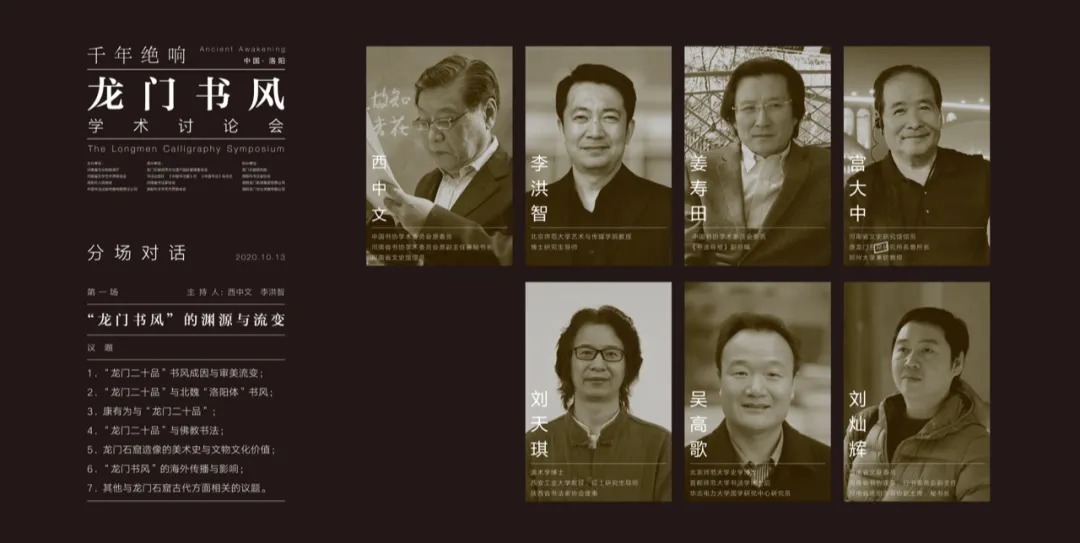 论坛分两场进行。第一场由西中文、李洪智主持,姜寿田、宫大中、刘天琪、吴高歌、刘灿辉以“‘龙门书风’的审美、渊源与流变”为主题,围绕“‘龙门二十品’书风成因与审美流变”“‘龙门二十品’与北魏‘洛阳体’书风”“康有为与‘龙门二十品’”“‘龙门二十品’与佛教书法”“‘龙门书风’的海外传播与影响”等议题进行研讨。