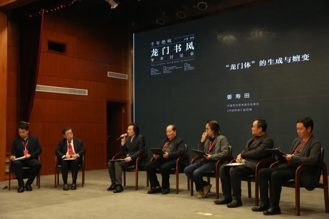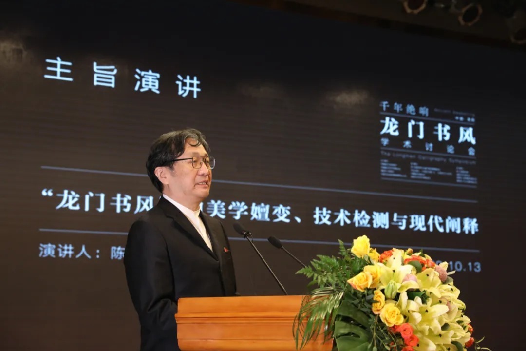 随后,陈振濂作题为《“龙门书风”的美学嬗变、技术检测与现代阐释》主旨演讲。他结合龙门造像题记图例,从“‘龙门二十品’:中国书法史上的‘非典型性’经典”“‘龙门书风’的基本审美特征”“‘龙门书风’的美学定义”“‘龙门书风’之现代阐释”等方面阐释了“龙门书风”的内涵。