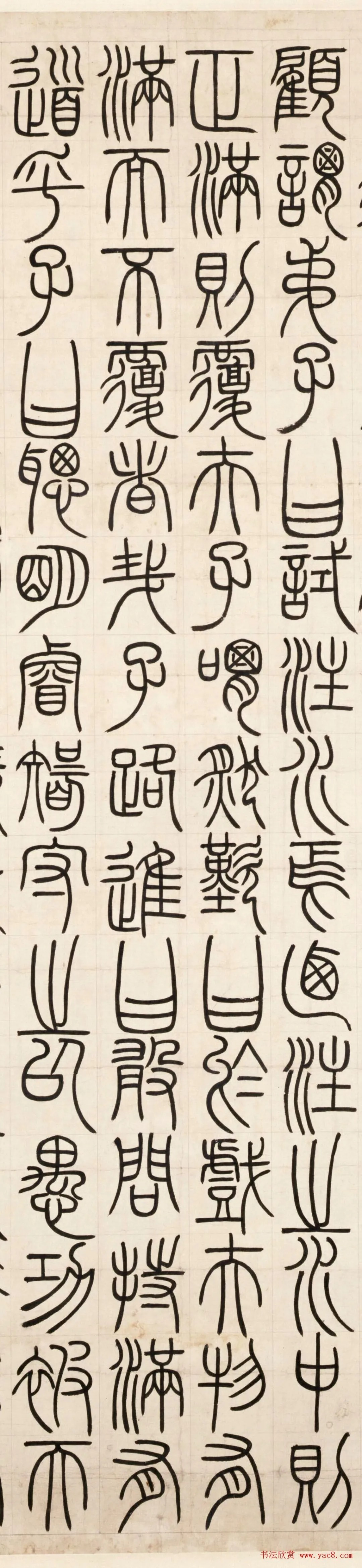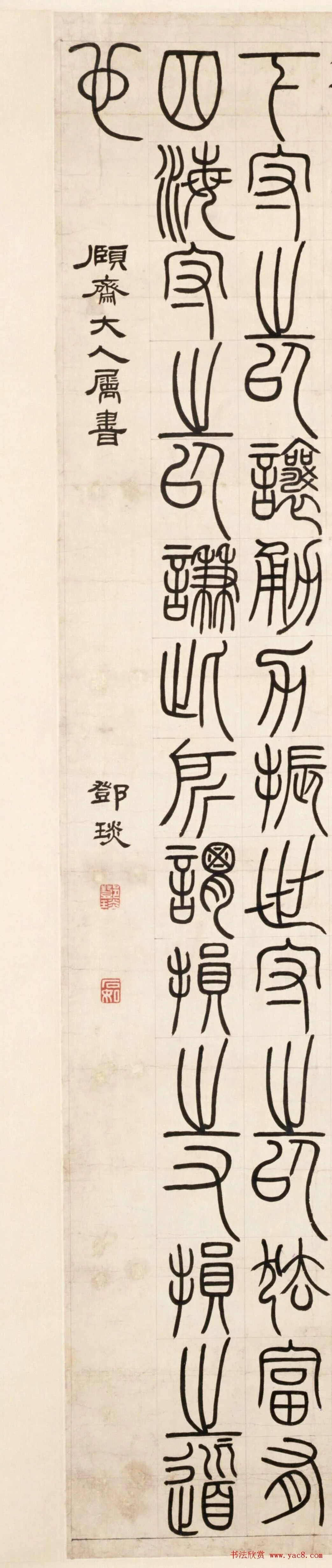 邓石如篆书有多种面貌,早期谨守古法,中年后突破传统玉箸篆风格,融入金石铭文的特点,并掺入隶书笔法,具有婉丽圆劲、洒脱自如的风貌。此作为邓石如早期篆书精品,深受秦《峄山碑》及唐李阳冰篆法影响,属传统玉箸篆范畴,笔画匀细圆熟,收笔处略出锋,结构谨严,风神清朗俊爽。