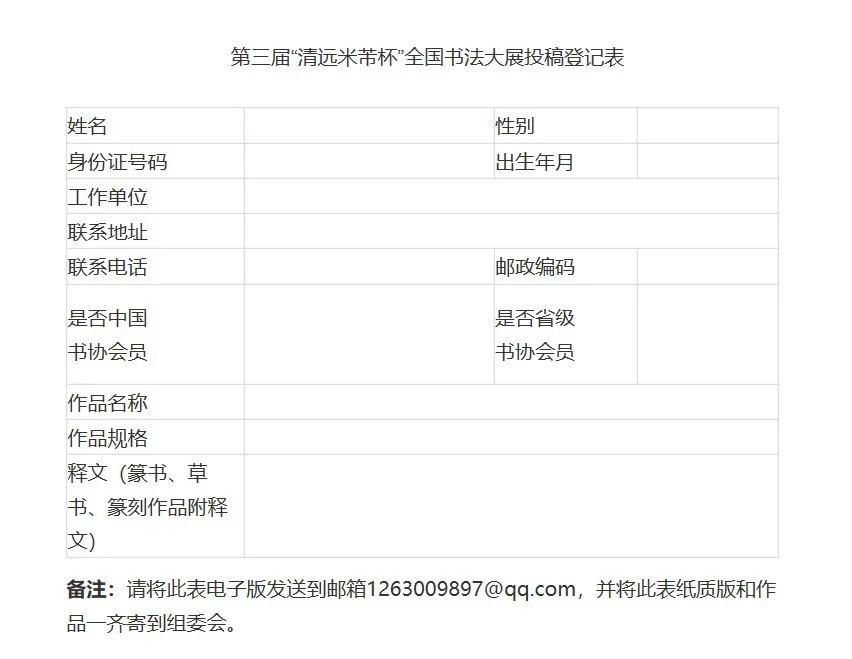 (5)投稿时请填写《第三届“清远米芾杯”全国书法大展投稿登记表》电子版和登记表。登记表可在广东省书法家协会微信公众号、书法思考微信公众号、无线清远app、清远市书法家协会微信公众号下载。电子版登记表发送到电子邮箱1263009897@qq.com,纸质版登记表连同身份证复印件、汇款单(即退稿费、保险费)复印件及其它相关复印件,随作品一并寄出。如不按要求投寄,作品不予受理。