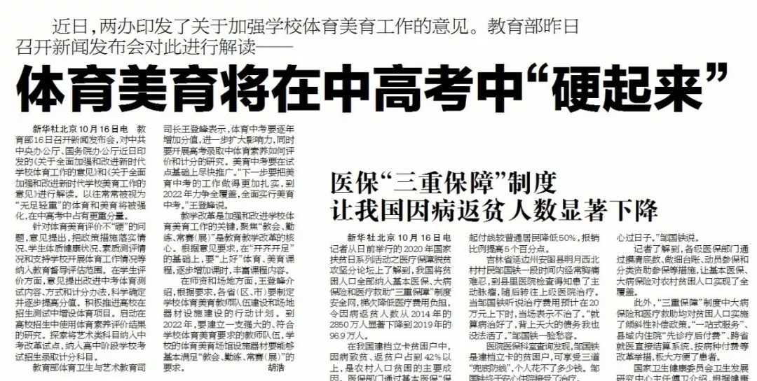文章称,教育部16日召开新闻发布会,对中共中央办公厅、国务院办公厅近日印发的《关于全面加强和改进新时代学校体育工作的意见》和《关于全面加强和改进新时代学校美育工作的意见》进行解读。以往常常被视为“无足轻重”的体育和美育将被强化,在中高考中占有更重分量。