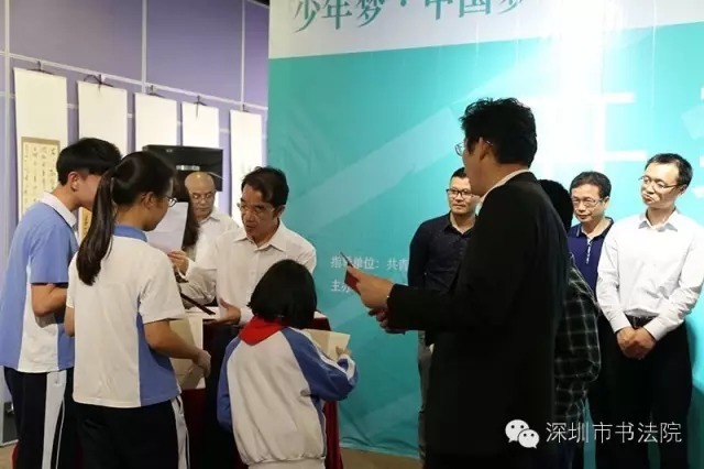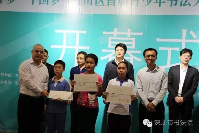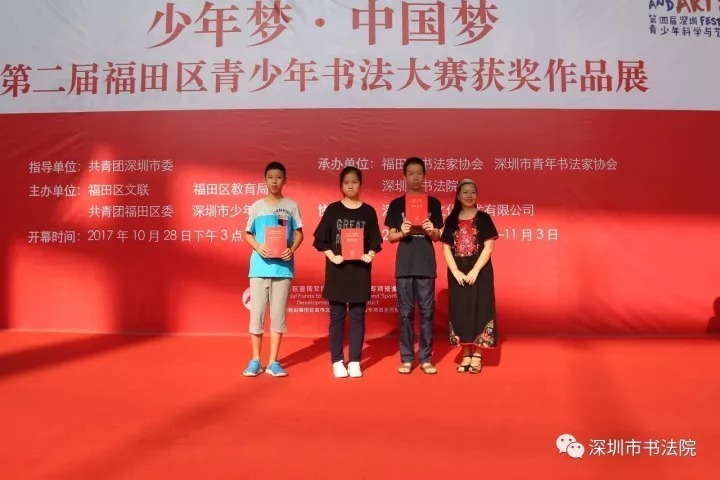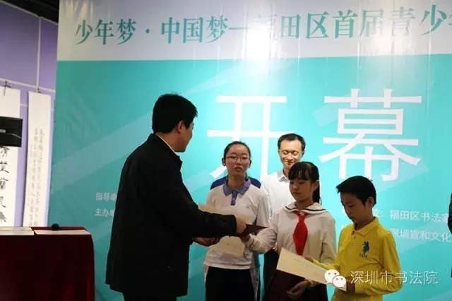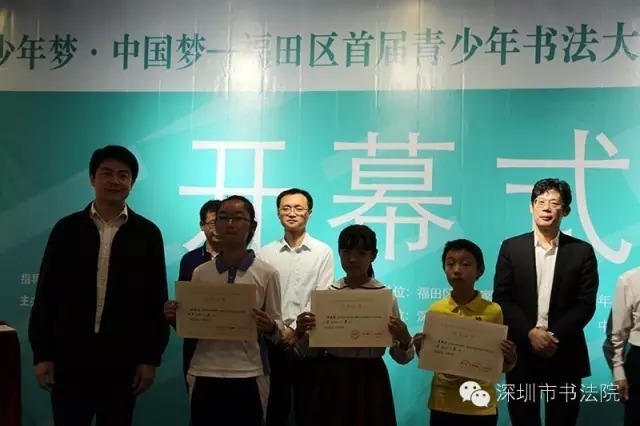 时任福田区团委书记李捷及福田区书协主席、深圳市青年书协主席、深圳市书协副主席、深圳市书法院院长赵永金为三等奖获奖代表颁发获奖证书