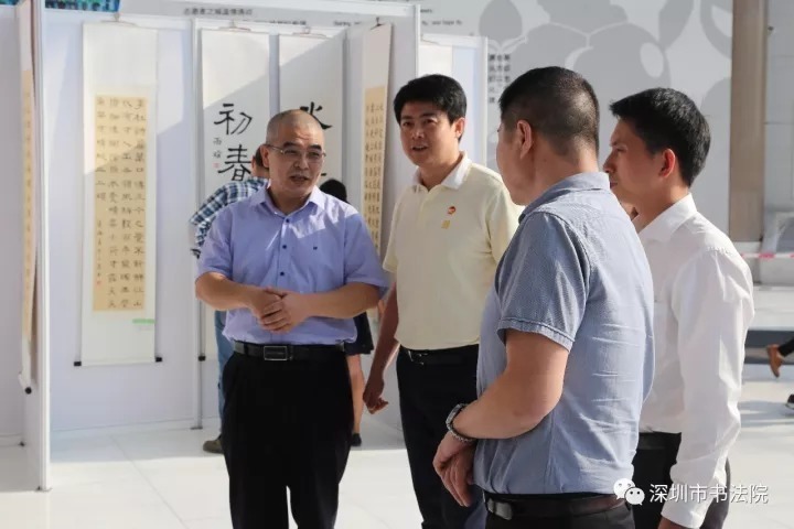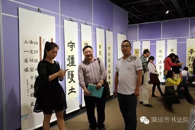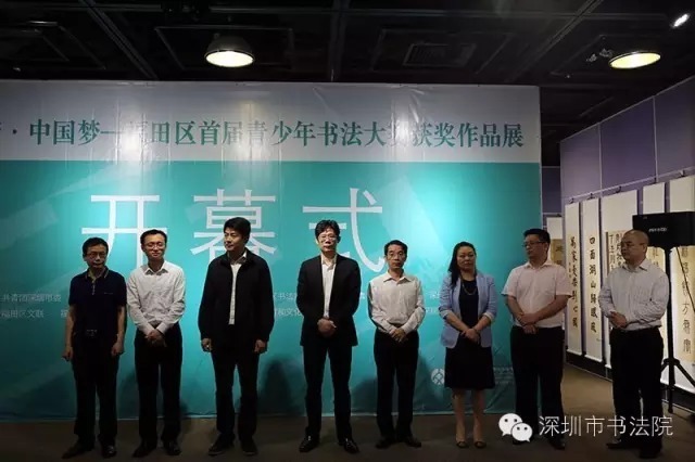 时任共青团深圳市委副书记刘广阳(左三),时任福田区文体局局长简定雄(左四),时任福田区文联主席刘国威(右四),时任福田区团委书记李捷(左二),深圳博雅艺术有限公司副总经理吴火松(左一),深圳博雅文物商店经理王敏(右三),深圳市青联副秘书长杜欣(右二),福田区书协主席、深圳市青年书协主席、深圳市书协副主席、深圳市书法院院长赵永金(右一)参加开幕式