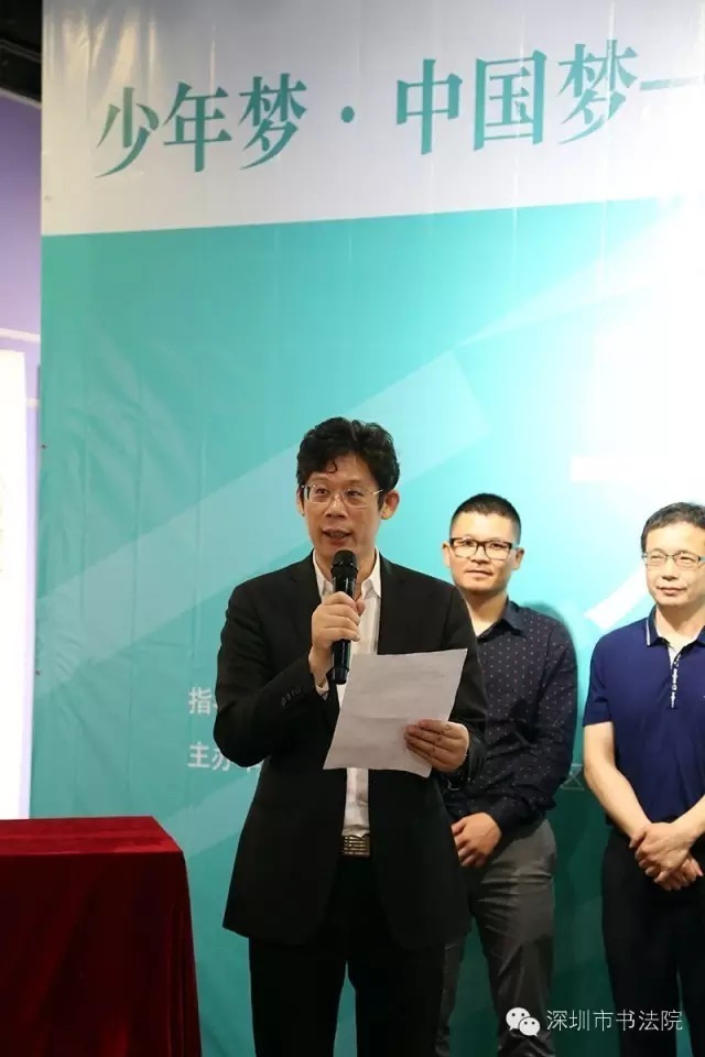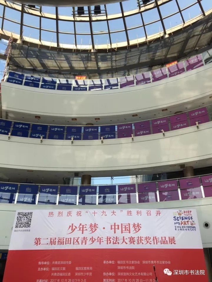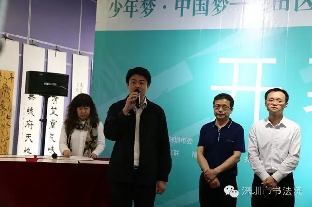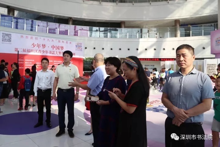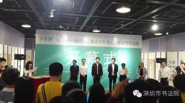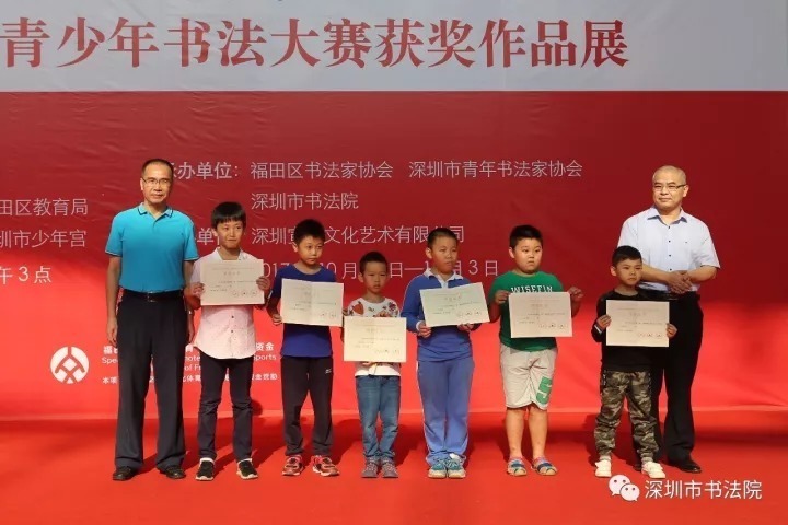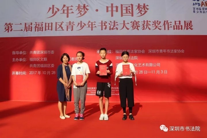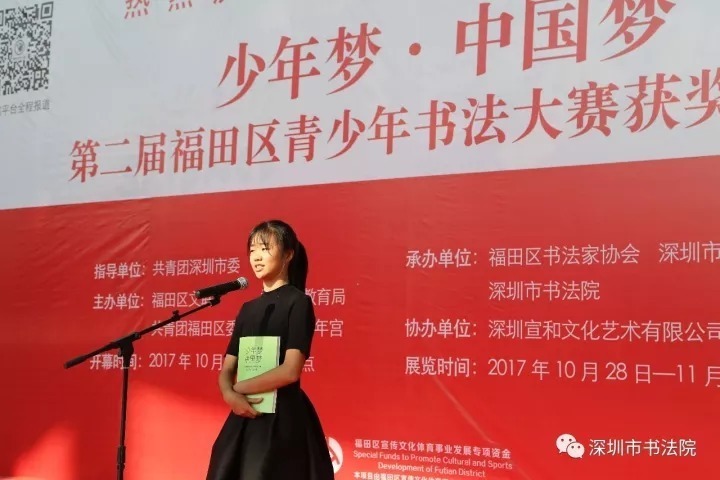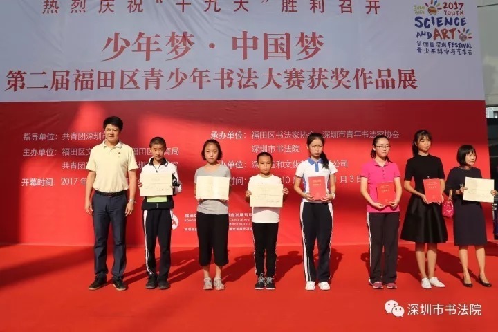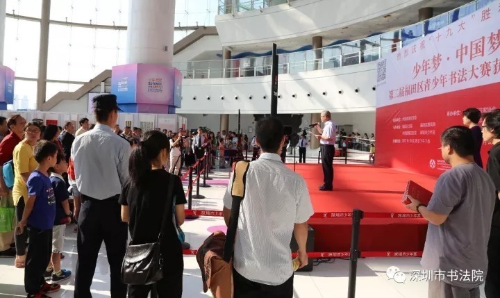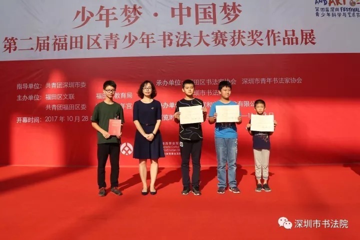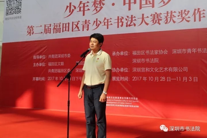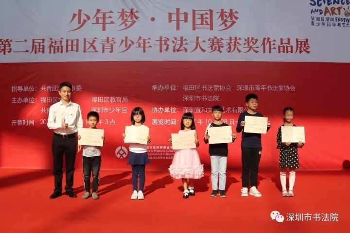 “少年梦-中国梦” 第二届福田区青少年书法大赛获奖作品展 开幕时间 2017年10月28日下午3:00 展览时间 2017年10月28日—11月3日 展览地点 深圳市少年宫 深圳市少年宫外景 展厅位于深圳市少年宫“水晶石大厅” 时任共青团深圳市委书记刘广阳讲话对展览活动予以高评,并对福田青少年书法事业寄以厚望 深圳福田区书协副主席、深圳技术大学副教授徐磊主持开幕式 策展人:福田区书协主席、市青年书协主席、市书协副主席赵永金介绍展览筹备情况 获奖代表李雨宸同学发表获奖感言 时任共青团深圳市委书记刘广阳为一等奖获奖作者代表颁奖 时任市委老干部局副局长王小蓉为中学组二等奖获奖代表颁奖 时任市委组织部干部一处调研员曾红英为小学组二等奖获奖代表颁奖 时任区文联副主席王云英为中学组三等奖获奖代表颁奖 福田区团委书记罗耿彪为小学组三等奖获奖代表颁奖 福田区梅丽小学副校长黄现丰、深圳市书法院院长赵永金为小学组优秀奖获奖代表颁奖 嘉宾展览现场观展 家长学生观展
