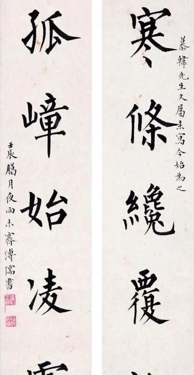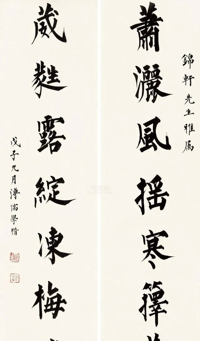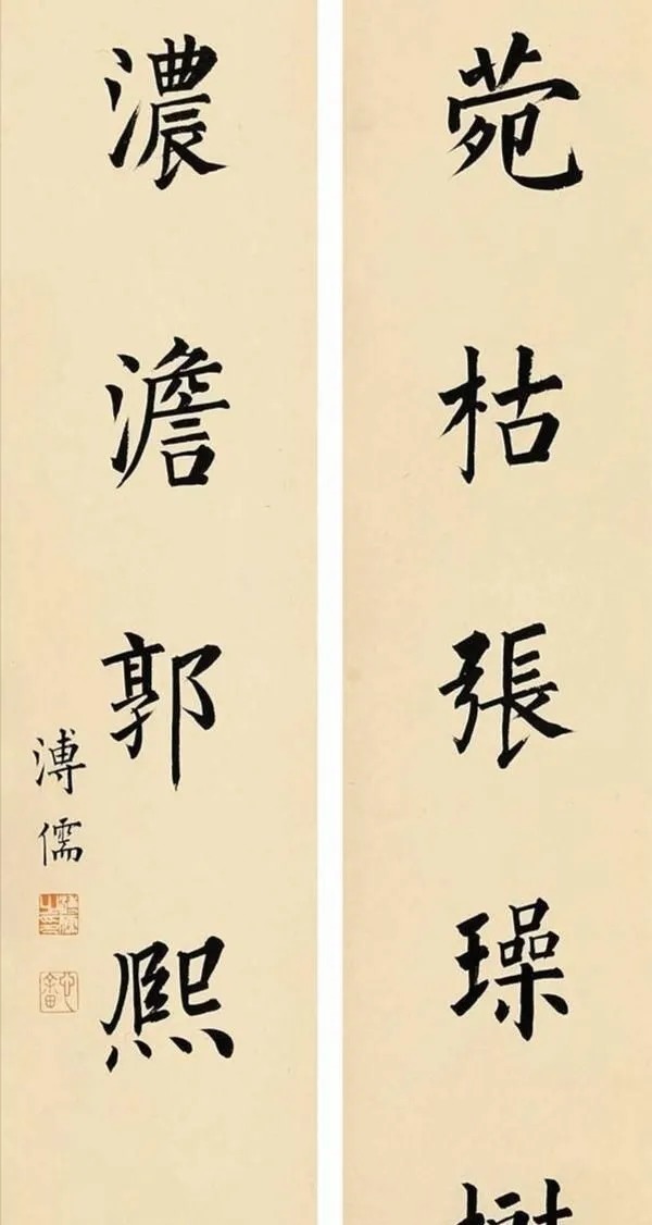 溥濡的大字楷书主要学的是唐代名家。尤其是欧阳询和柳公权,对他的用笔影响很大。当然了,他的书法还受到了成亲王的影响。总体来说,他的楷书,用笔精到,法度性强,特别是在起笔和收笔处,棱角分明,斩钉截铁,力道十足。