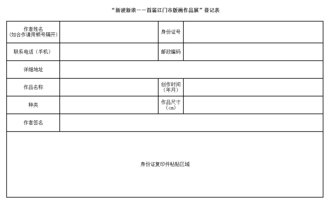 指导单位: 江门市文化广电旅游体育局 广东省美术家协会版画艺委会 主办单位: 江门市美术馆 江门市文化馆 江门市美术家协会 协办单位: 新会区美术馆 台山市美术馆 开平市美术馆 各市区美协 学术主持: 钟 曦(省美协版画艺委会主任)、宋光智(省美协版画艺委会副主任) 艺术顾问: 黄元(黄新波之女) 学术组员: 郑星球(省美协版画艺委会秘书长) 吴锐鸿 寇雁鸣 策展人: 王畅怀 蔡朝阳 展览统筹: 苏 志 展览事务: 马 雪 郭小理 李艺峰 黄炳壮 杨宇远 李强稳 作品题材不限,主题不限,以反映江门五邑人文风景、自然景观、改革成果及五邑名家活动等相关题材创作的版画作品优先评奖。内容积极向上、具有正能量。 备注:外地作者的作品必须是表达江门五邑相关题材(可在江门网上搜索资料)的作品方可参与评奖 金奖,3名,奖金:税前5000元(即收藏费); 银奖,5名,奖金:税前4000元(即收藏费); 铜奖,10名,奖金:税前3000元(即收藏费); 优秀奖若干 2021年初(具体时间另行通知 江门市美术馆 1、征集作品对象: 江门五邑及全国各地广大版画爱好者,均可报名投稿。(非江门五邑籍作者投稿作品必须是反映江门五邑人文历史、风土人情及五邑名家等题材才能参与评奖) 2、征集作品要求: (1)限作者本人近5年内的原创版画作品。 (2)作品装裱后最长边不得超过2米,特殊尺寸请提前与李老师(0750-3936207)沟通。 (3)每位作者作品数量不得超过3幅(组)。 1、征集作品:将投稿作品以电子图片形式(6M以上,700万像素以上,JPG格式)并标注展览名称+作者姓名+作品名称+尺寸(高cm x 宽cm)+创作年代+种类+联系电话,在2020年12月31日前以附件的形式上传或打包发送至441394456@qq.com,(凡不按要求投稿或超时投稿的,主办单位有权取消作品参评资格。)如需核实是否投搞成功,可在截稿前联系收稿工作人员进行核实。(截稿后反馈视为无效反馈)。联系人:李老师0750-3936207。初评结果另行通知(视疫情及展期安排情况而定)。 2、复评作品: 复评作品原件需自行装裱,每件作品需填写附件一《“新波新浪——首届江门市版画作品展”登记表》,并打印粘贴在作品背面。邮寄或自行送到江门市美术馆展厅前台。 3、邮寄方式: 邮寄地址:广东省江门市蓬江区院士路五邑华侨广场江门市美术馆展厅前台 邮编:529000 收件人:江门市美术馆展厅前台 办公时间:周二到周日 9:00—16:30 联系电话:0750-3932996 全部作品原则上于展览结束后三个月内全部退还作者。 1、展览将根据送展作品数量及质量进行奖项设置,凡获奖入选作品均颁发证书,入选作品均可作为申请加入市美协的一次资格条件。 2、金银铜奖之获奖作品颁发奖金(即收藏费)后均由江门市美术馆收藏。 3、复评作品原作必须是征集作品(图片),不许随意更换参赛作品,严禁盗用、抄袭他人作品,一经发现取消参展资格,所有产生的法律责任由作者自行承担。 4、主办单位对参展作品有展览、研究、摄影、录像、出版及宣传权。 5、凡送作品参评、参展作者,视为已确认并遵守征稿启事的各项规定。 6、本活动解释权归展览组委会。 附件一“新波新浪——首届江门市版画作品展”登记表 下载方法: 1、复制下方链接: https://docs.qq.com/sheet/DQklQdlFRaERJcVZ6 在浏览器打开,导出WORD文档。 2、扫下方二维码或者长按屏幕,识别下方二维码。
