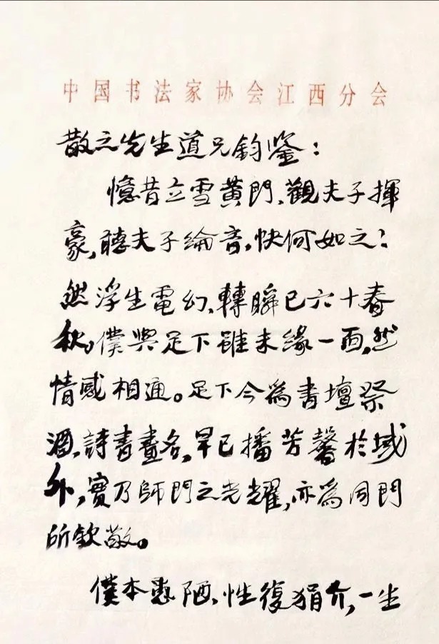 然浮生电幻,转瞬已六十春秋。仆与足下虽未缘一面,然情感相能通。足下今为书坛祭酒,诗书画名,早已播芳馨于域外,实乃师门之耀,亦为同门所钦敬。