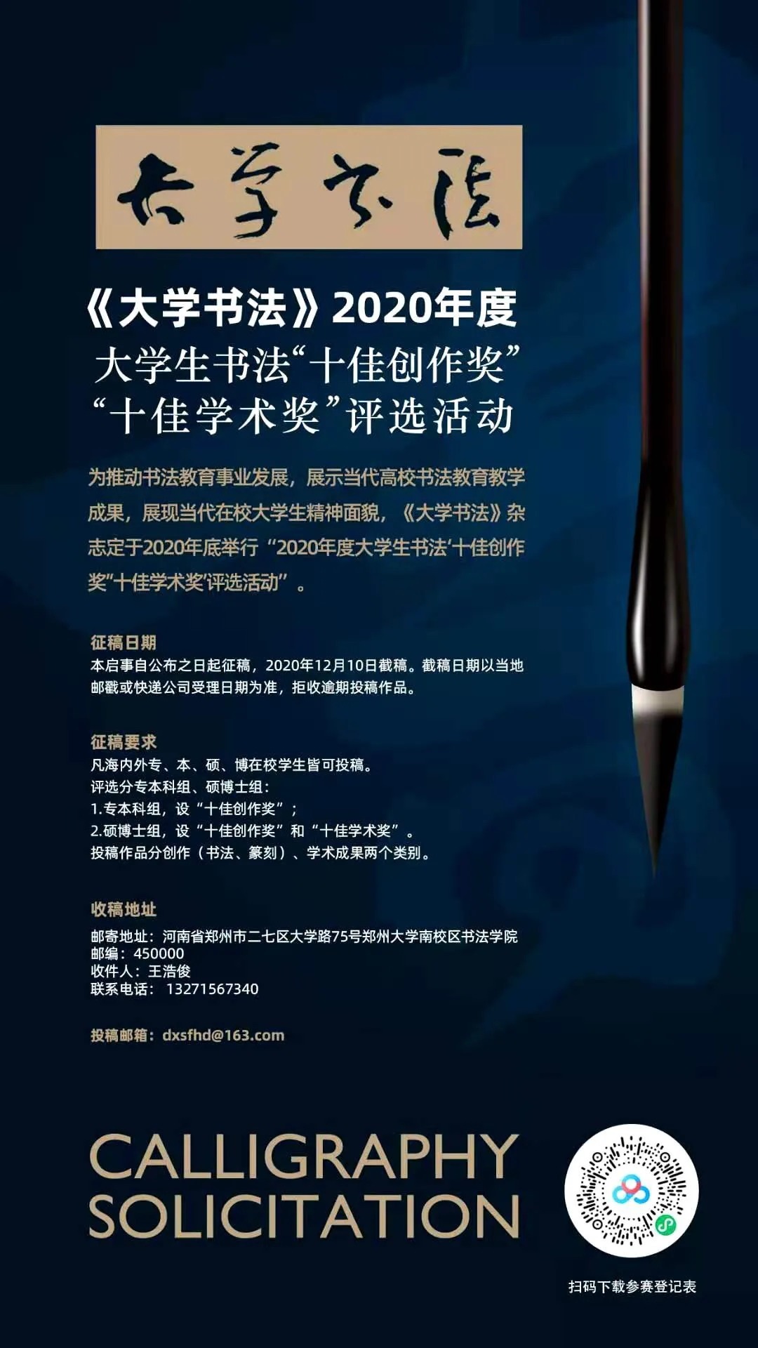 为推动书法教育事业发展,展示当代高校书法教育教学成果,展现当代在校大学生精神面貌,《大学书法》杂志定于2020年底举行“2020年度大学生书法‘十佳创作奖’‘十佳学术奖’评选活动”。一、征稿要求