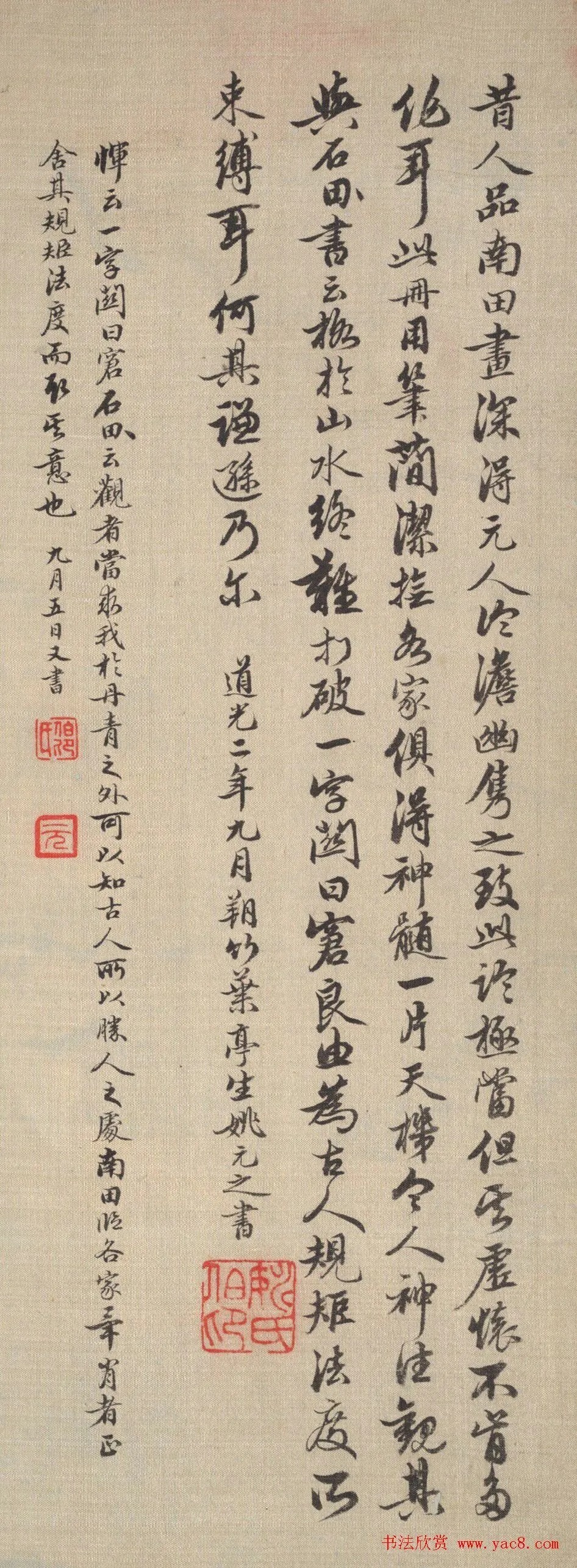 姚元之(1776-1852),字伯昂,号荐青,又自称竹叶亭生。嘉庆十年(1805)进士,官至工部右侍郎,擢左都御史。姚元之文章淡雅,书画并工。《枕经堂题跋》称其书法是“波撇神风”、“今人不让古人”。
