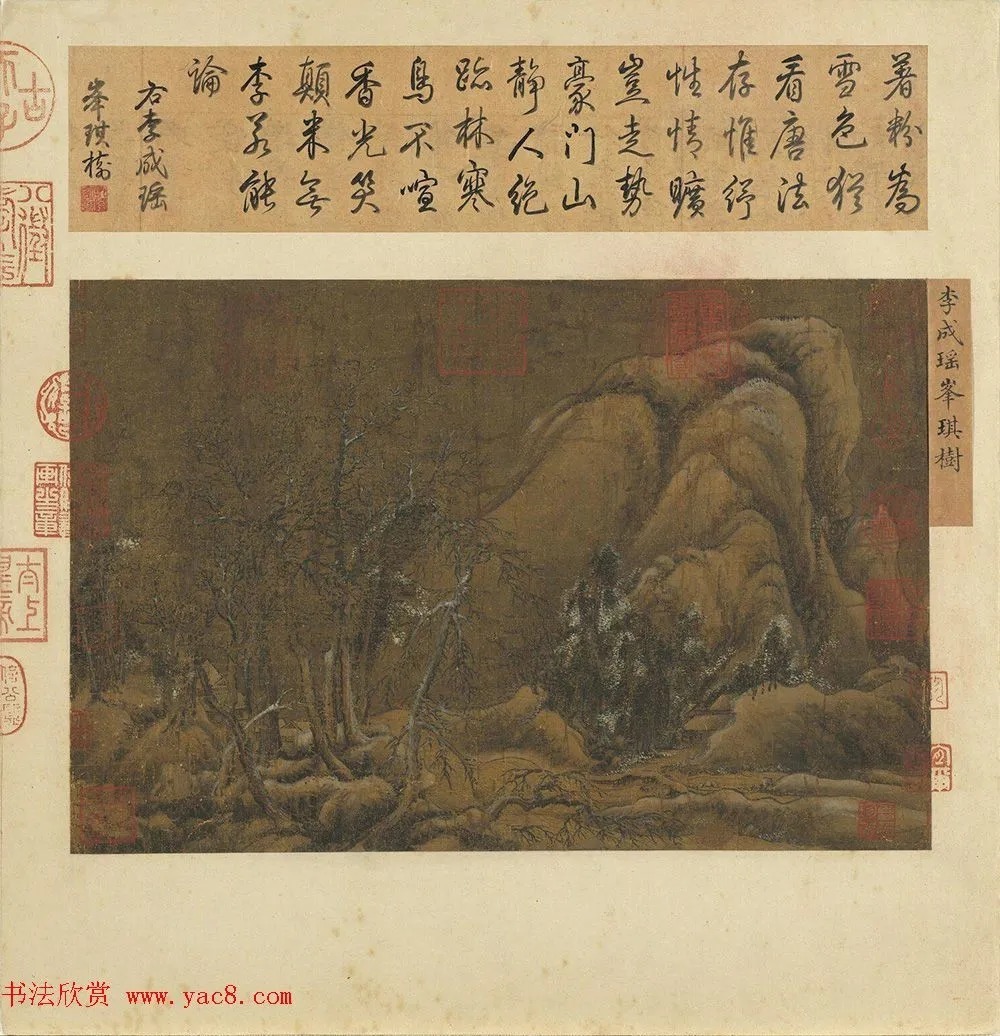 董其昌行草书题北宋_李成(传)_瑶峰琪树图,绢本册页,24.1x36厘米,台北故宫博物院藏。