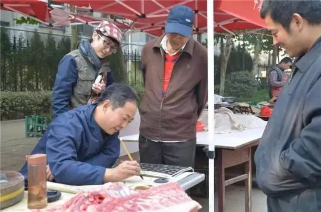 这位书者在没有顾客时也不忘练上几笔。他专注的神情好像并非在闹市,支起肉摊仅为生活,于他或许练字才是生活。