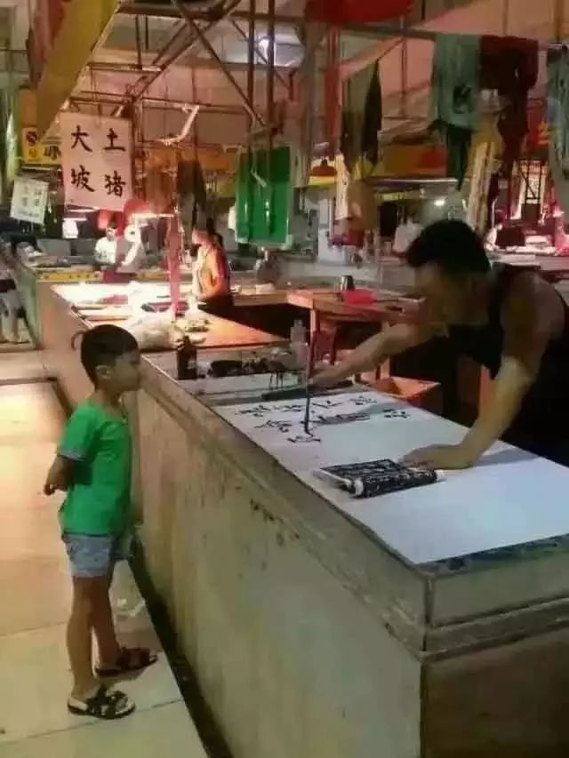 这位书者应该是个豪放之人,专门腾出了宽敞的位置来挥毫作书。前面挂着的“大坡土猪”也许就是出自他的手。如果是,那功夫不浅!而前方驻足观赏的小朋友,与这位书者产生了某种无言的沟通,说不定,这位小朋友就因为这次的观赏而对书法产生了浓厚的兴趣。