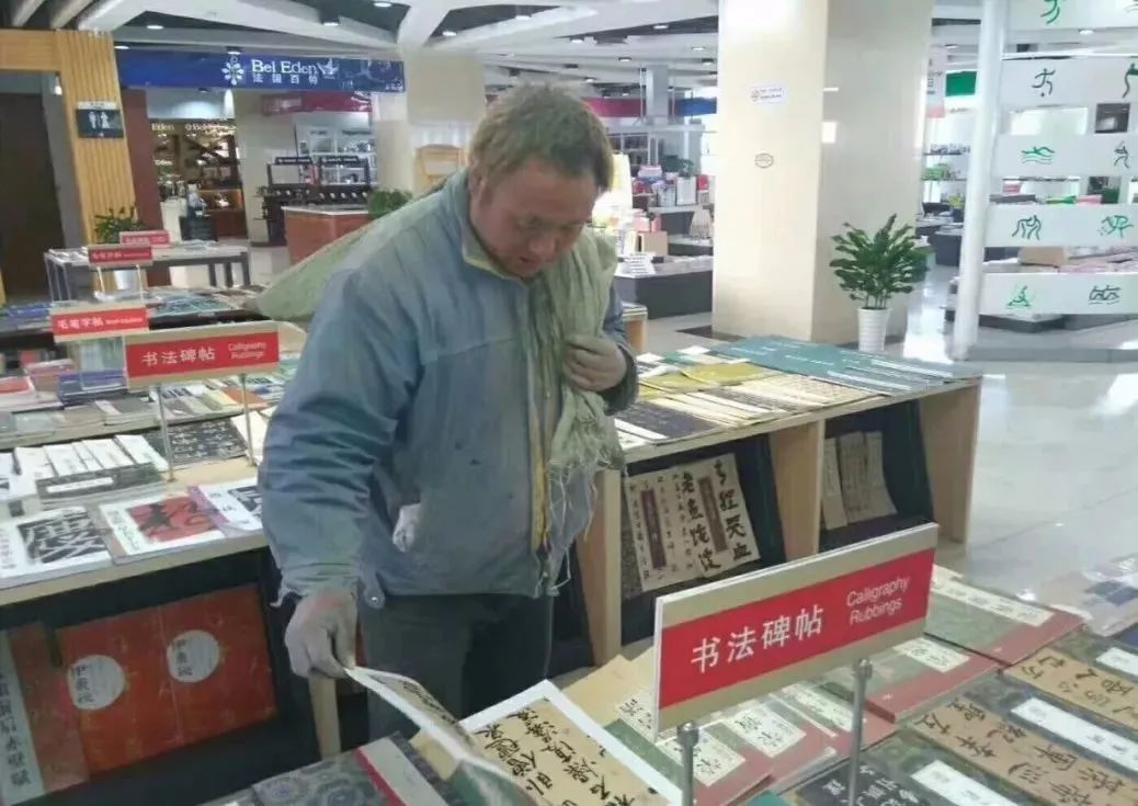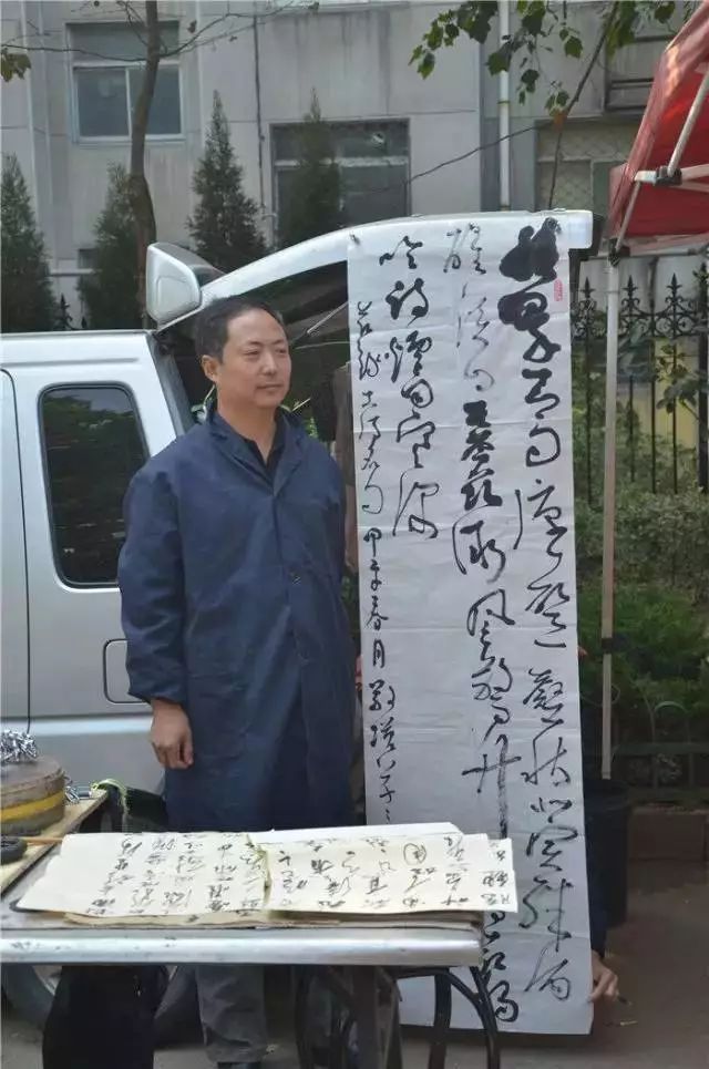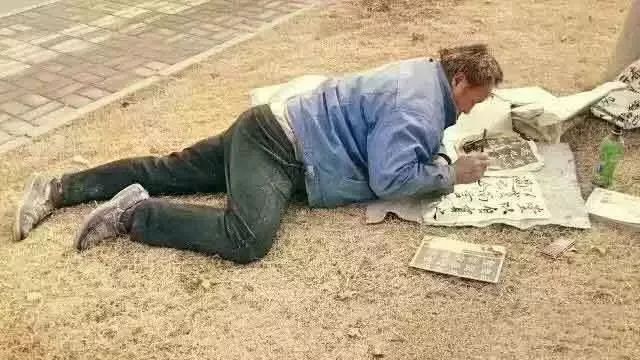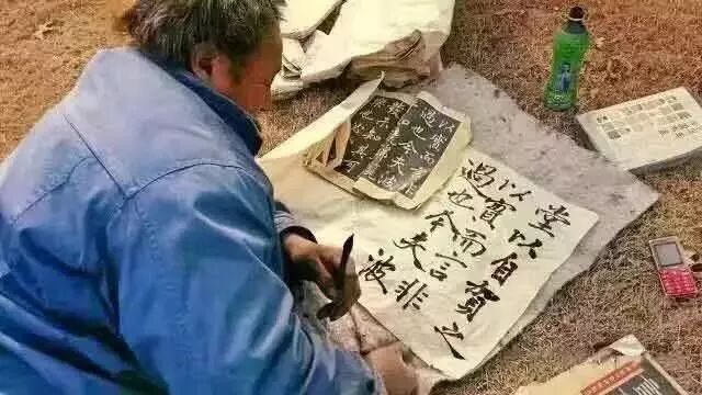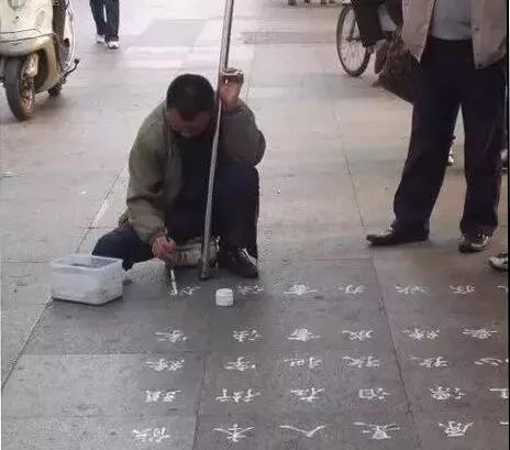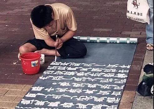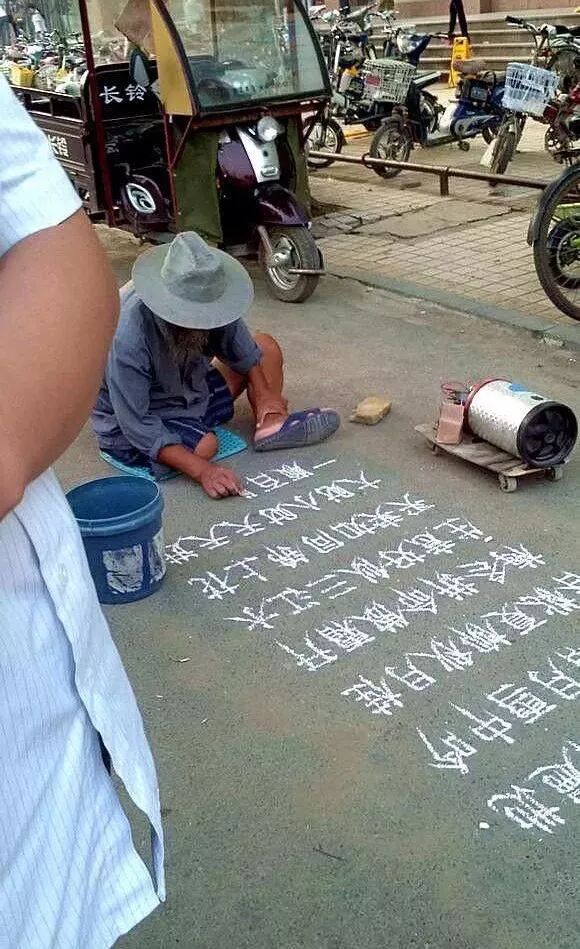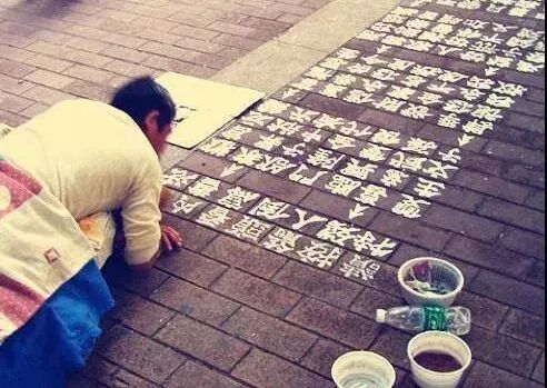 这位书者虽然工具简陋,身体残缺,但却一笔一划书写于闹市,看看这字,是否不疾不徐,令人肃穆?