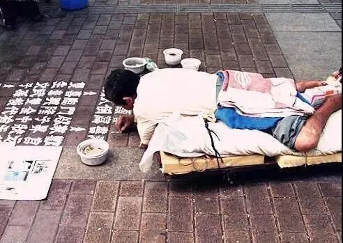 在大街上我们经常会看到这样的乞丐,他们或者仅有手,或者只有脚,甚至手脚全无,但仍操笔作书,写得一手好字!