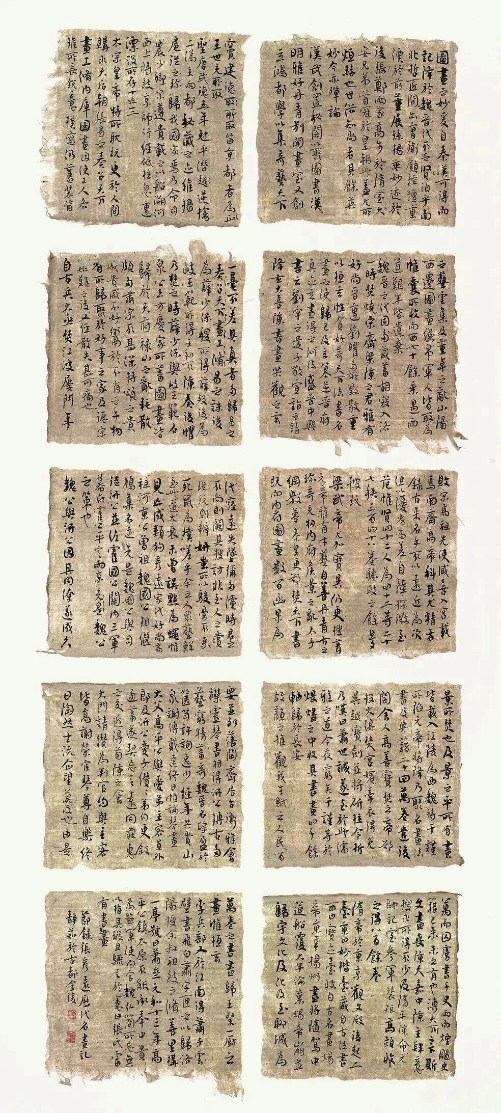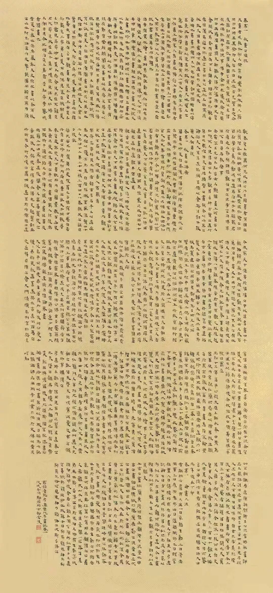 我十二届国展的投稿作品内容选择了张彦远《历代名画记》部分章节,作品形式采用将近四尺整张鎏金蜡染宣纸分五块书写,未打草稿,未做装饰。书写时纸墨相发,得心应手,一气呵成,未写第二遍,直接投稿并顺利入展,感谢中国书协与评委,并为伟大时代感到自豪,由衷地点赞。