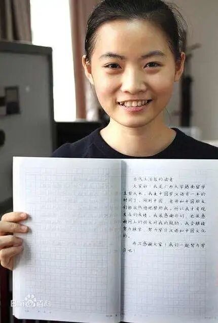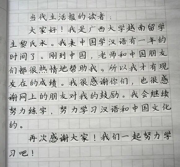 黎氏水是广西大学有名的“网络红人”。她刚到南宁,学习汉语仅13个月的她凭借一手漂亮的汉字,被老师将其作品展示到网络平台,引发大量网友围观。黎氏水书写的汉字工工整整,笔锋有力,与书本里的印刷字体相似,令许多中国网友感叹“自愧不如”。