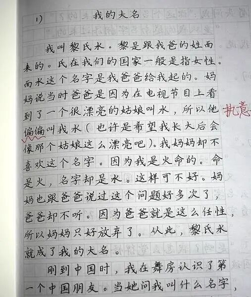 此时,广西大学国际教育学院孟瑞森老师拿出了学生们的作业本,很快翻找到了黎氏水的作业本,作业本里有一篇黎氏水写的作文《我的大名》,以及一些名言名句抄写,也都书写得十分工整漂亮。