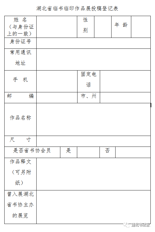湖北省临书临印作品展征稿启事 为贯彻落实习近平新时代中国特色社会主义思想和党的十九大精神,弘扬优秀传统文化,坚定文化自信,进一步推动湖北省书法艺术界加深对习近平总书记关于传统文化创造性转化和创新性发展的要求,全面展示我省书法创作成果,湖北省书法家协会、十堰市文联决定联合举办湖北省临书临印作品展。现公告如下: 一 举办单位 主 办:湖北省书法家协会 十堰市文学艺术界联合会 承 办:十堰市书法家协会 协 办:十堰武当书画院 十堰美术馆 媒体支持:《书法报》社 《十堰日报》传媒集团 二 征稿要求 1.投稿范围 年满18岁以上在湖北长期居住、工作,或湖北籍在外工作的公民均可投稿。 2. 作品要求 (1)书法与篆刻均可投稿,包括临摹与创作两部分。 (2)临摹作品,限定古代经典作品(清代及清代以前)。 (3)创作作品,内容要追求真善美,传递正能量。诗、词、曲、赋、联、文等体裁不限。鼓励自作诗文,内容健康向上。使用他人诗文,应注意使用权威版本,保持准确连贯和相对完整,落款处注明原作者姓名及诗文名称。投稿作者须遵守《著作权法》及相关法律规定,确保书写内容不存在著作权、名誉权等争议和纠纷。因书写内容而产生的纠纷,由投稿作者负责。 (4)书法作品:临摹作品要求保持相关文字内容相对连贯完整。创作作品风格须与所临经典相对应,保持明显的取法渊源关系,是对所临经典的学习、思考与升华。 作品规格、要求:尺寸为6尺整张以内(高度不超过180cm,宽度不超过97cm),一律为竖式。小字类(单字直径为2cm以内)作品尺寸为4尺整张以内(高度不超过138cm,宽度不超过69cm),一律为竖式。手卷作品尺寸高度不超过35cm,长度不超过248cm。册页作品尺寸每页高宽不超过40cm,页数不超过12页。所有作品请勿装裱(册页除外)。不符合尺寸要求者不予评选。 (5)篆刻作品:8—12方,边款不少于2枚。其中4方临摹作品、4—8方创作作品。请附所临篆刻经典作品复印件。创作作品要求与所临经典的元素基本一致,对所临对象进行创作与升华。 印屏规格、要求:一律竖式,136cm×35cm。另附印蜕及边款一份用于入选后宣传、出版。 评审结束后,通知入展作者在指定时间内将一方指定原石邮寄至本启事收件处,该原石与投稿印屏一并出版、展出,展览结束后由主办方收藏。如在规定时间内未收到入展作者原石,视为自动放弃入展资格。 3.投稿数量 书法:每种书体每位作者限投临摹、创作作品各1件;最多可投3种书体。 篆刻:每位作者限投印屏1件。 4.费用 本次展览免收参评费,限于人力,恕不退稿。征稿期间不办理换稿、退稿等事宜。 5.填写信息 (1)请在作品背面右下角用铅笔正楷注明:作者真实姓名、性别、身份证号、常用通讯地址、邮编、联系电话、作品名称、作品尺寸。 (2)为便于准确登记,及时联系作者,请认真填写《湖北省临书临印作品展投稿登记表》连同身份证复印件、所临碑帖复印件、作品释文随作品一并寄出。 6、征稿日期 自公告之日起,至2020年4月20日止,以当地邮戳为准。 7、收稿地址 湖北省十堰市江苏路8号阳光花园内街十堰市书法家协会,邮编:442000, 联系人:李永涛或刘亚军 联系电话:17771914488 13597892136 三 入展待遇 1、评审 ①由湖北省书法家协会适时组织评审委员会、监审委员会依照“公平、公开、公正”原则进行评审。评审结果及时在《书法报》、书法报网和湖北书法家微信公众号对外公示。 ②入展规模:200件左右,不设等次奖,设评委优秀作品提名30件。每位入展作者展出作品1件。 2、作者待遇 ①非湖北省书法家协会会员且符合入会基本条件者入展即具备入会资格。 ②颁发证书,赠送展览作品集1本,邀请入展作者参加展览开幕式(交通、住宿费用自理); ③入展证书、作品集除在展览现场颁发外,其余未到场者将在开幕式后1个月内寄达作者。 ④向30名优秀作者发放作品收藏费1000元(税后)。 四 活动解释权归湖北省书法家协会 附:湖北省临书临印作品展投稿登记表 湖北省书法家协会 2019年10月30日