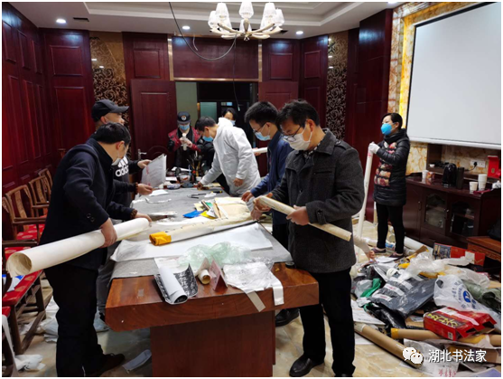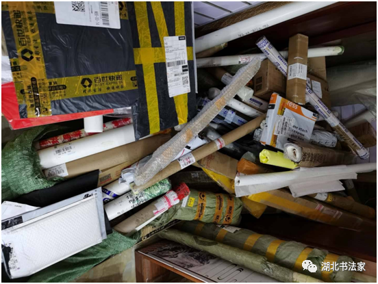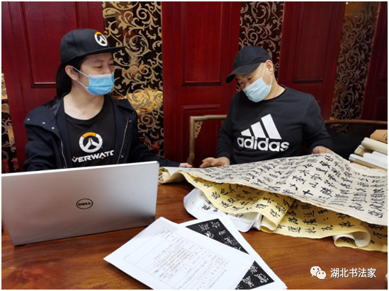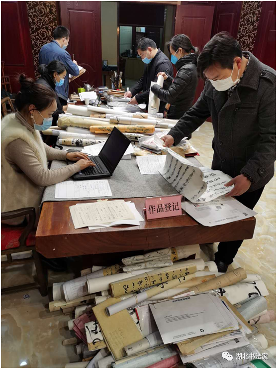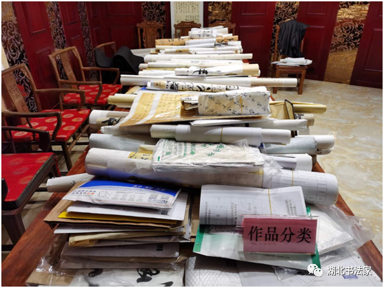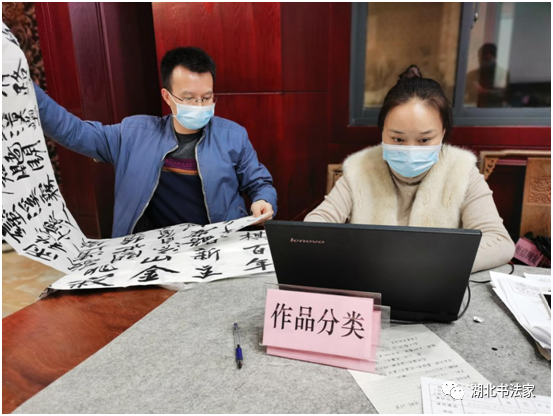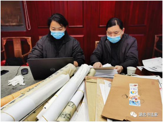 在工作现场,工作人员按照事先研定的工作方案,有序对邮件进行消杀、拆件、书体分类、电脑登记、短信回复等,做到了不漏登、不错登、作品流转轨迹清晰。从拆分情况看,本次来稿水平普遍较高,取法乎上,技艺兼备,格调文雅,风格多元,创作态度端谨,用纸用墨讲究,比较全面地展示了湖北书艺的扎实功底与创作实力。但受疫情及其他因素的影响,来稿作品也存在书体、地域不平衡,从来稿书体看,行草占大宗,其次为楷书,隶书稍逊,篆书、篆刻较少;从来稿地域看,武汉、襄阳、荆州较多,其他地市州略弱。同时,登记中发现,少数作者因没有仔细阅读《征稿启事》,存在有临无创、有创无临、临创无关、尺寸不合、硬笔投稿、用印草率、形式过甚、笔墨浅显、资料不全等不足。