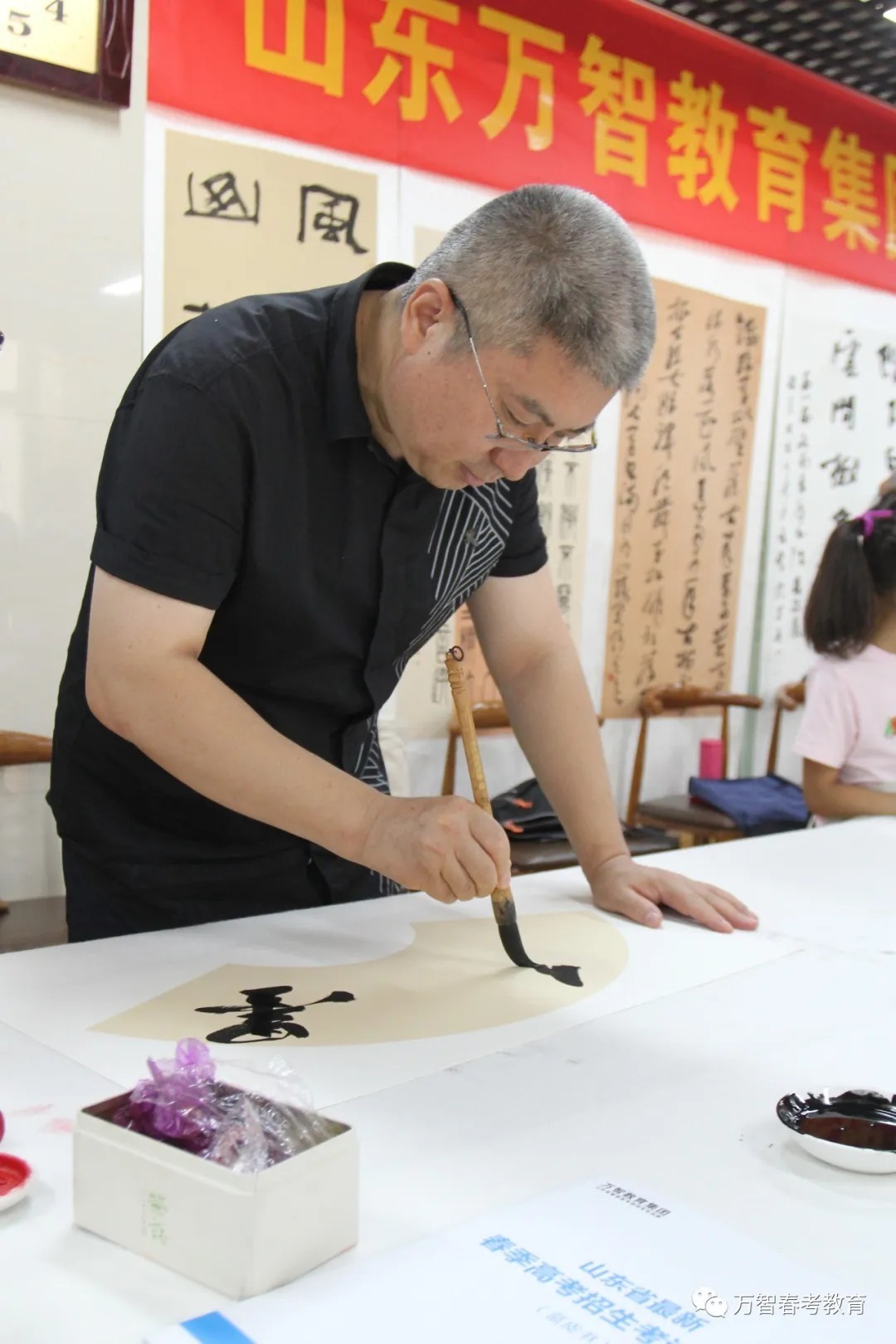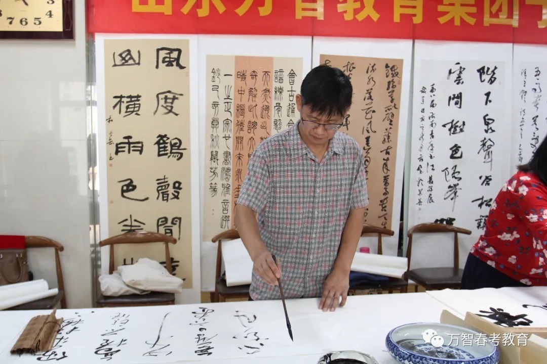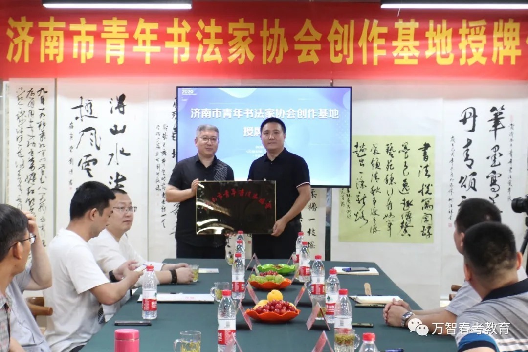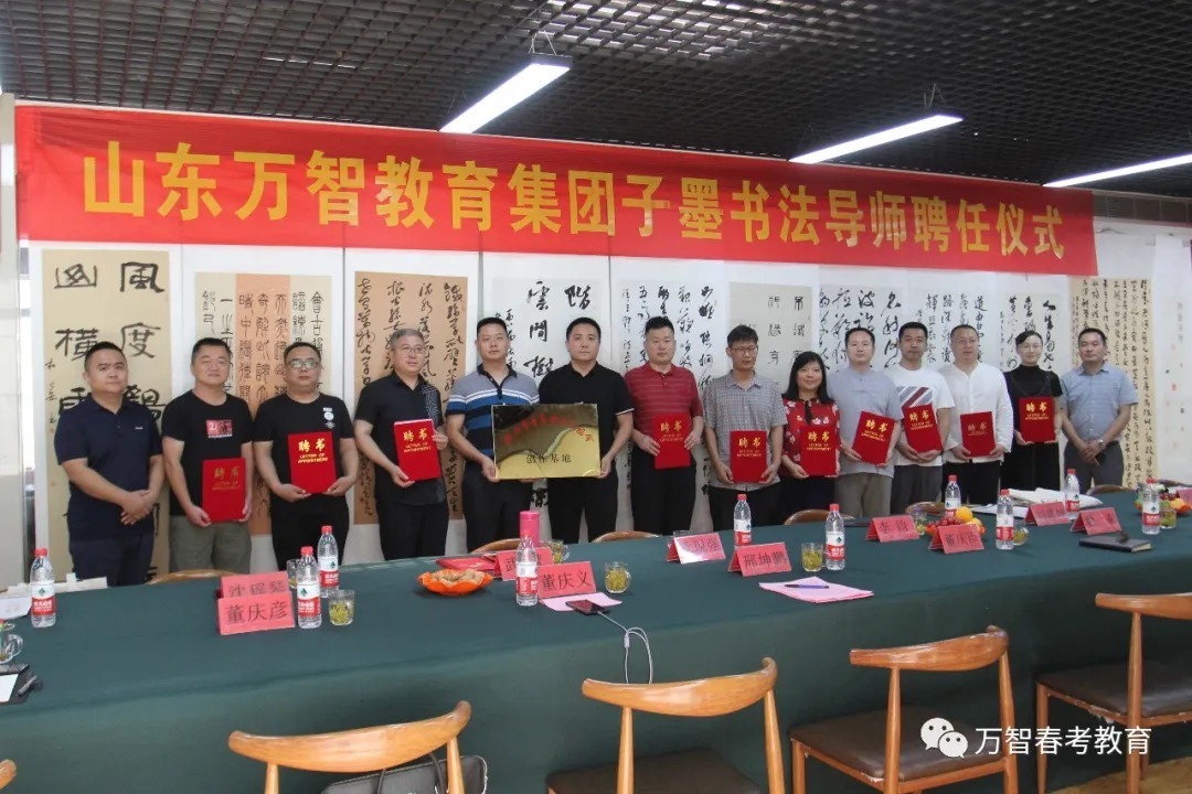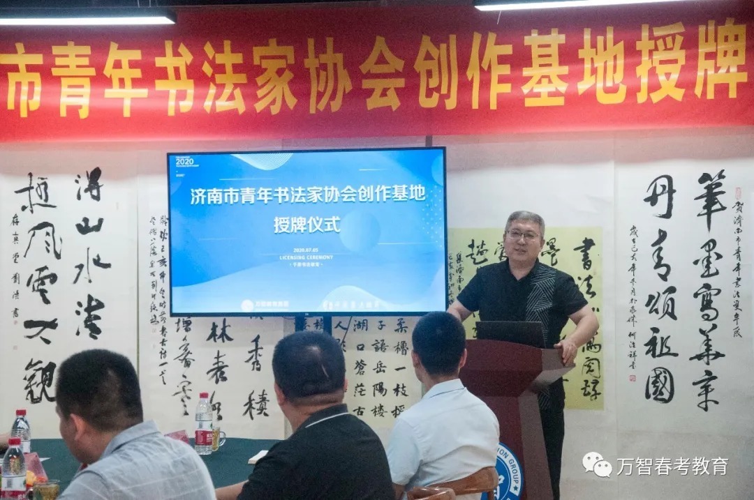 创作基地揭牌仪式前,省市青年书协有关领导详细考察了解了万智教育集团的教育教学和管理服务工作,给予了高度评价。    揭牌仪式上,万智教育集团总校长董庆义首先对各位领导和专家的到来表示衷心的感谢和热烈的欢迎,并简要介绍了万智教育集团的发展概况,集团自2009年创办以来,经过十余年的发展,旗下拥有5所学校和1个教育科技研发机构,成为集高中教育、幼儿教育、艺术教育、教育科技和教育服务为一体的现代化综合性教育集团,以“成为全国著名的特色教育品牌”为愿景,“为人民满意的教育服务”为使命,聚焦特色教育,推动优质教育资源供给和均衡发展,促进教育公平和教育现代化。旗下子墨书法教育培训学校“以人为本、 因材施教、知能合一”的办学理念和集团紧跟时代脉搏、传递教育正能量的教育使命。    沈瑶琴主席在即席发言中指出,万智教育集团的教育规模和教育质量在济南市乃至整个山东都有口皆碑,是山东民办教育的典范。子墨书法教育培训学校教学理念先进,教学设施一流,师资力量雄厚,发展潜力巨大。以董校长为代表的校领导班子成员年轻有为,真抓实干,取得的业绩令人称赞。更可贵的是,万智教育集团在倾力办学的同时,积极投身社会公益事业,组织参与数十项颇有影响力的社会教育公益活动:先后举办了第一、二、三届山东省职业教育发展高峰论坛暨春季高考专题研讨会;为庆祝新中国成立70周年,展现新时代教师风采,2019年12月,由集团协办的“雅风在兹”山东省首届教师书画展在济南成功举办;今年2月,集团联合省当代教育研究院共同发起“携手抗疫、助力复学”公益活动,历时14天,行程7000公里,覆盖全省16地市,向50所高中基地学校共捐赠价值25万余元的防疫物资,这种高度的社会责任感可圈可点,值得敬佩。    沈主席的即席发言引起现场各位艺术家的共鸣,纷纷为子墨书法创作基地的发展殷切寄语。武斌主席表示:万智教育集团久负盛名,学校“立德树人,科学管理,教学相长”的理念让人印象深刻,祝福子墨书法教育行稳致远,再创辉煌。党现强主席从美育教育的角度强调了书法教育在文化、美学、生活方面的深远意义,并祝愿子墨书法教育稳步发展,再创佳绩。李钧主席畅谈了此次书法交流和创作揭牌的感受,并对创作基地未来的发展充满信心。景彪主席表示,通过现场参观,感觉子墨书法教育培训学校教学师资力量很强,实行军事化管理,非常严格正规,值得点赞,希望青年书协的各位专家与学校携手共进,推动青少年书法教育深入普及。济南市青年书协副主席刘潜坤、吴秀峰、李之刚,主席团委员谷伟,常务副秘书长孙瑒也纷纷对子墨书法创作基地的建设发展、优秀传统文化传承发展发表了真知灼见。    为表达对济南市青年书协第十一个创作基地——子墨书法创作基地成功揭牌的衷心祝贺,省市青年书协各位艺术家在创作基地现场挥毫泼墨,创作了一件件精品力作,并为现场观摩的学校师生做了示范讲解,使学校师生充分领略到书法艺术的魅力。    万智教育集团总校长董庆义代表全校师生诚恳表示,希望这次揭牌仪式以后,各位艺术家经常性地关心指导子墨书法创作基地。得到各位艺术家的一致赞同后,学校领导为各位艺术家现场颁发社会公益导师聘书。           翰墨薪传,踵事增华。各位公益艺术家与学校师生一致表示,济南市青年书法家协会子墨书法创作基地的成立,对促进学校的书法教学、教师队伍建设,培养更多优秀青年书法艺术人才,推动泉城青少年书法教育事业健康发展,必将发挥积极作用。