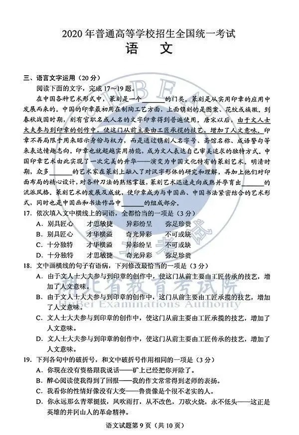 三、语言文字运用(20分) 阅读下面的文字,完成17—19题。 022020年高考语文试卷(全国I卷)
