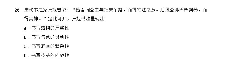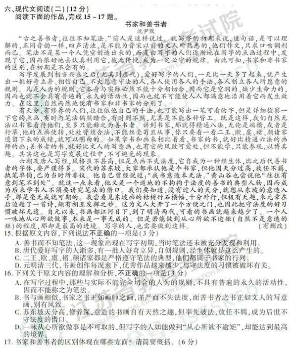 2020年高考语文(全国ΙΙ卷含答案) 03 文字版 唐代书法家张旭曾说:“始吾闻公主与担夫争路,而得笔法之意。后见公孙氏舞剑器,而得其神。”据此可知,张旭书法呈现出(  ) 在此提醒明年参加高考的学子 千万不要小看书法知识 平时多注意积累 这些分,万万不可失去哦! 再看看往年高考 考过的和书法有关的试题 04 2019高考语文试题(江苏卷) 来源:江苏省教育考试院 清晰文字版 ﹀ 2019年语文高考(江苏卷) 六、现代文阅读(二)(12分)       阅读下面的作品,完成15-17题。 书家和善书者 沈尹默 “古之善书者,往往不知笔法”前人是这样说过。就写字的初期来说,这句话,是可以理解的,正同音韵一徉,四声清浊,是不能为晋宋以前的文人所熟悉的,他们作文,只求口吻调利而已。笔法不是某一个人凭空创造出来的,而是由写字的人们逐渐地在写字的点画过程中,发现了它,因而很好地去认真利用它,彼此传授,成为一定必守的规律。由此可知,书家和非书家的区别,在初期是不会有的。 写字发展到相当兴盛之后(尤其到唐代),爱好写字的人们,一天比一天多了起来,就产生出一批好奇立异、相信自己、不大愿意守法的人,各人使用各人的手法,各人创立各人所愿意的规则。凡是人为的规则,它本身与实际必然不能十分相切合,因而它是空洞的、缺少生命力的, 因而也就不会具有普遍的、永久的活动性,因而也就不可能使人人都满意地沿用着它而发生效力。在这里,自然而然地便有书家和非书家的分别了。 有天分、有修养的人们,往往依他自己的手法,也可能写出一笔可看的字,但是详细检察一下他的点画,有时与笔法偶然暗合,有时则不然,尤其是不能各种皆工。既是这样,我们自然无法以书家看待他们,至多只能称之为善书者。讲到书家,那就得精通八法,无论是端楷,或者是行草,他的点画使转,处处皆须合法,不能丝毫苟且从事,你只要看一看二王、欧、虞、褚、颜诸家遗留下来的成绩,就可以明白的。如果拿书和画来相比着看,书家的书,就好比精通六法的画师的画;善书者的书,就好比文人的写意画,也有它的风致可爱处,但不能学,只能参观,以博其趣。其实这也是写字发展过程中,不可避免的现象。 六朝及唐人写经,风格虽不甚高,但是点画不失法度,它自成为一种经生体,比之后代善书者的字体,要严谨得多。宋代的苏东坡,大家都承认他是个书家,但他因天分过高,放任不羁, 执笔单钩,己为当时所非议。他自己曾经说过:“我书意造本无法。”黄山谷也尝说他“往往有意到笔不到处”。就这一点来看,他又是一个道地的不拘拘于法度的善书的典型人物,因而成为后来学书人不须要讲究笔法的借口。我们要知道,没有过人的天分,就想从东坡的意造入手,那是毫无成就可期的。我尝看见东坡画的枯树石横幅,十分外行,但极有天趣,米元章在后边题了一首诗,颇有相互发挥之妙。这为文人大开了一个方便之门,也因此把守法度的好习惯破坏无遗。自元以来,书画都江河日下,到了明清两代,可看的书画就越来越少了。一个人一味地从心所欲做事,本来是一事无成的。但是若能做到从心所欲不逾矩(自然不是意造的矩)的程度,那却是最高的进境。写字的人,也需要做到这样。 (有删改) 15.根据原文内容,下列说法不正确的一项是(3分) A.善书者不知笔法,这一现象出现在写字初期,当时笔法还未被充分发现和利用。 B.唐代爱好写字的人渐多,有一批人好奇立异,自创规则,经生体就是这么产生的。 C.二王、欧、虞、褚、颜诸家都是严格遵守笔法的典型,他们都属于书家的行列。 D.元明清三代,书画创作每况愈下,优秀作品越来越少,与守法度的习惯被破坏有关。 16.下列关于原文内容的理解和分析,不正确的一项是(3分) A.在写字的过程中,那些与实际不能完全切合的人为的规则,不具有普遍的永久的活动性,因而不能称之为笔法。 B. 书与画相似,书家之书正如画师之画,谨严而不失法度,而善书者之书正如文人的写意画,别有风致。 C.苏东坡天分高,修养深,意造的书画自有天然之趣,但率先破法,放任不羁,成为后世不守法度的借口。 D.一味从心所欲做事是不可取的,但写字的人如能做到“从心所欲不逾矩”,却能达到最高的境界。 17.书家和善书者的区别体现在哪些方面?请简要概括。(6分) 05 (点击图片,了解详情) 06
