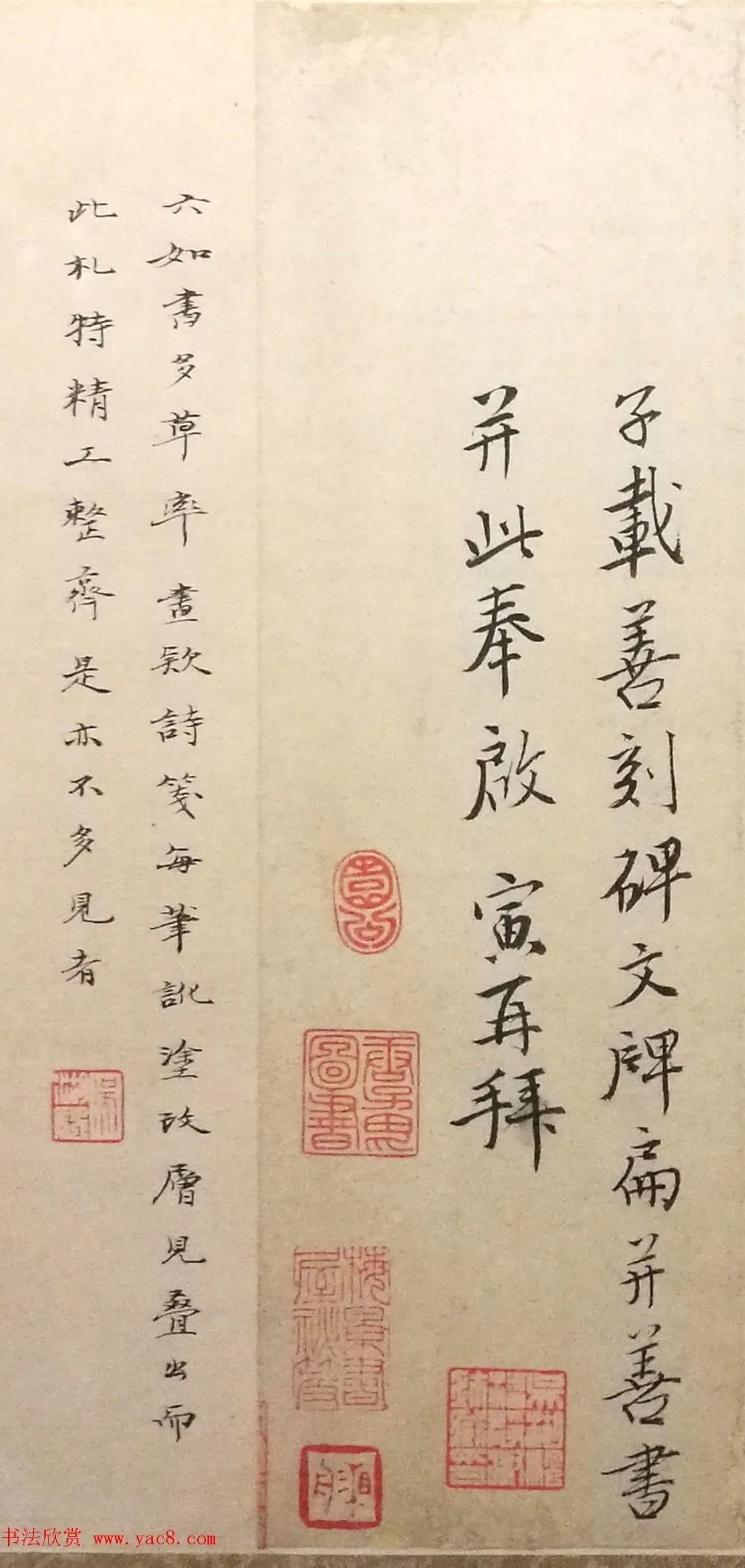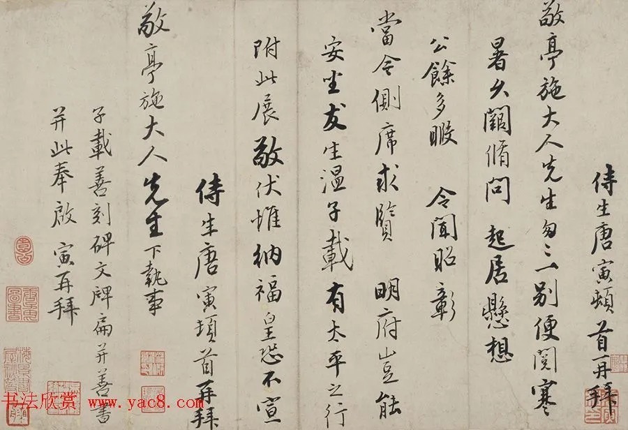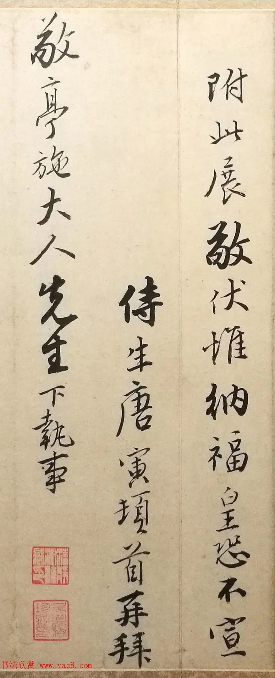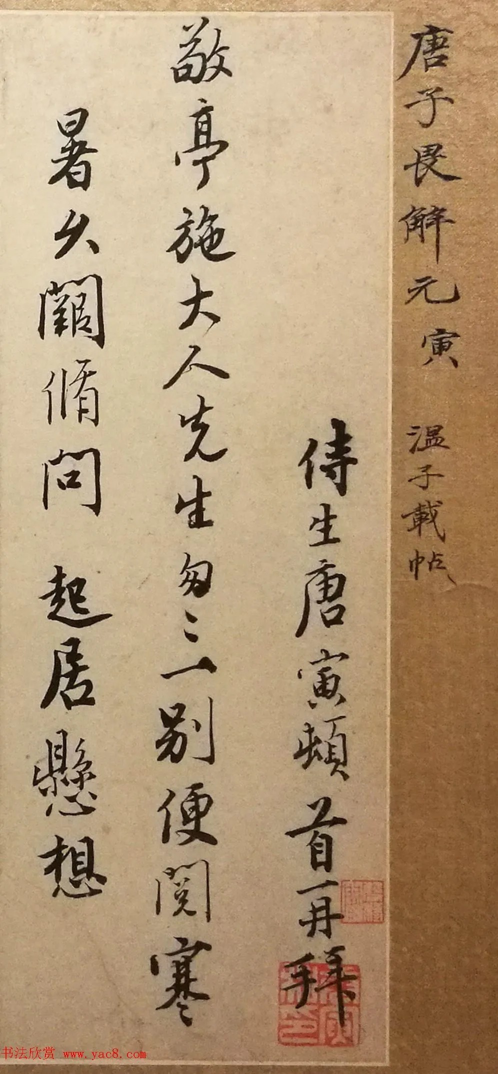 释文:侍生唐寅頓首再拜。敬亭施大人先生。匆匆一別,便閱寒暑,久闕修問起居,懸想公余多暇,令聞昭彰。當今側席求賢,明府豈能安坐。友生溫子載,有太平之行,附此展敬,伏惟納福,皇恐不宣。侍生唐寅頓首再拜。敬亭施大人先生下執事。子載善刻碑文、牌扁,并善書,并此奉啓。寅再拜。