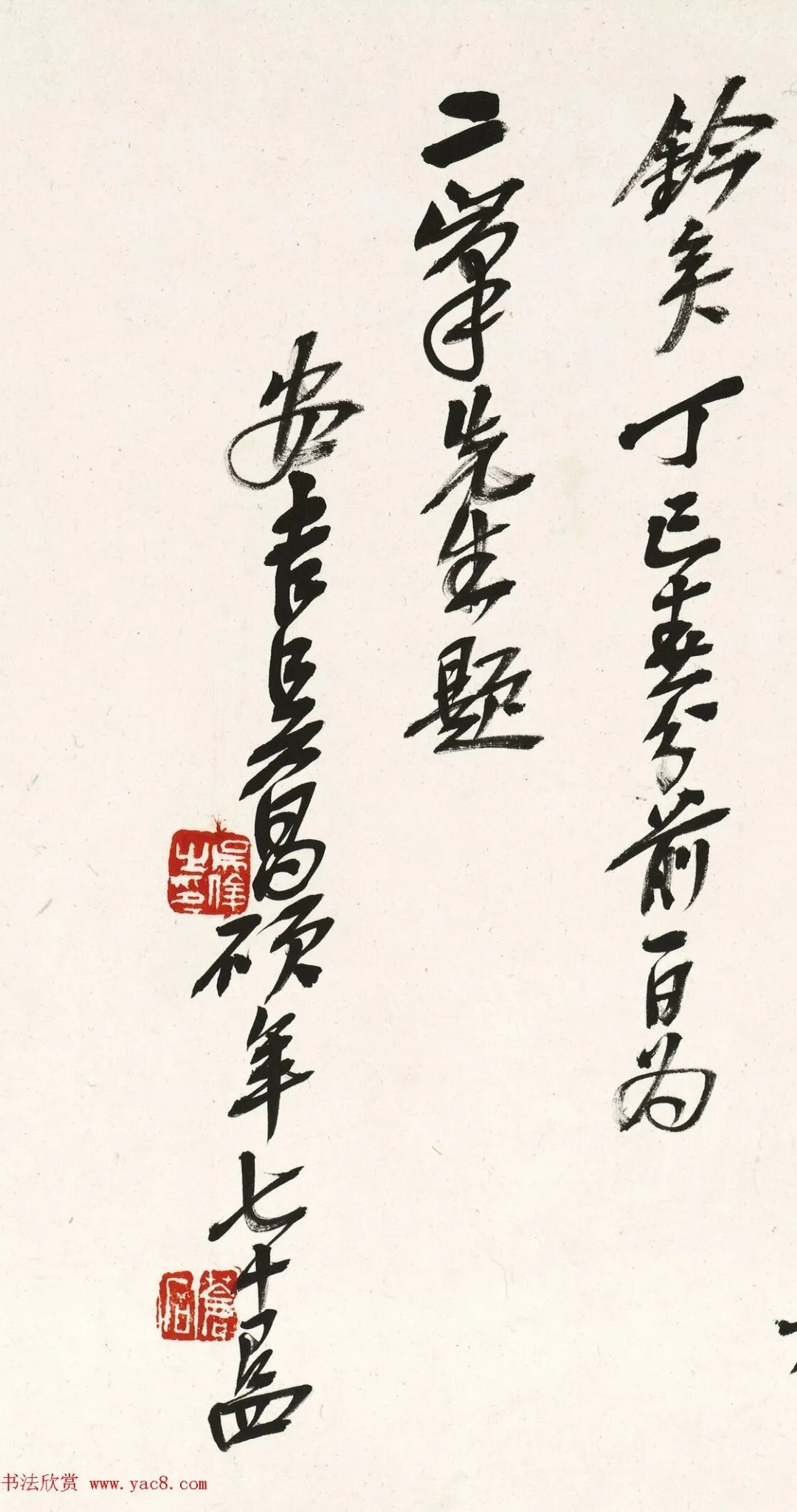 吴昌硕(1844-1927)清末著名书画家,篆刻家。原名俊卿,字昌硕,别号苦铁,浙江安吉人。吴昌硕的行书,得黄庭坚、王铎笔势之欹侧,黄道周之章法,个中又受北碑书风及篆籀用笔之影响,大起大落,遒润峻险。