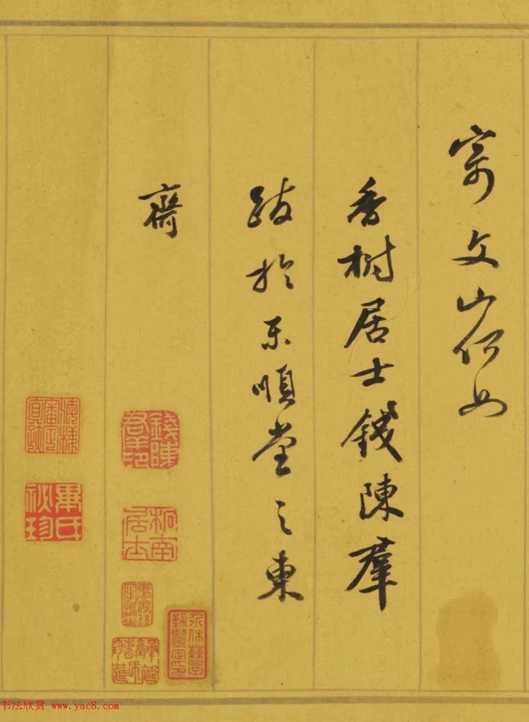 钱陈群(1686-1774),字主敬,号香树、柘南居士,嘉兴人。康熙六十年(1721)进士,授翰林院编修。雍正时,因赴陕西等地宣谕讲经,安抚百姓,被雍正夸奖为“安分读书人”,五升其官。乾隆时,任顺天府学政、刑部侍郎等职,为官有政绩,奖掖后进,多有上疏建言。钱陈群可谓“三朝元老”,晚年与当时苏州的沈德潜被称为“江浙二老”。