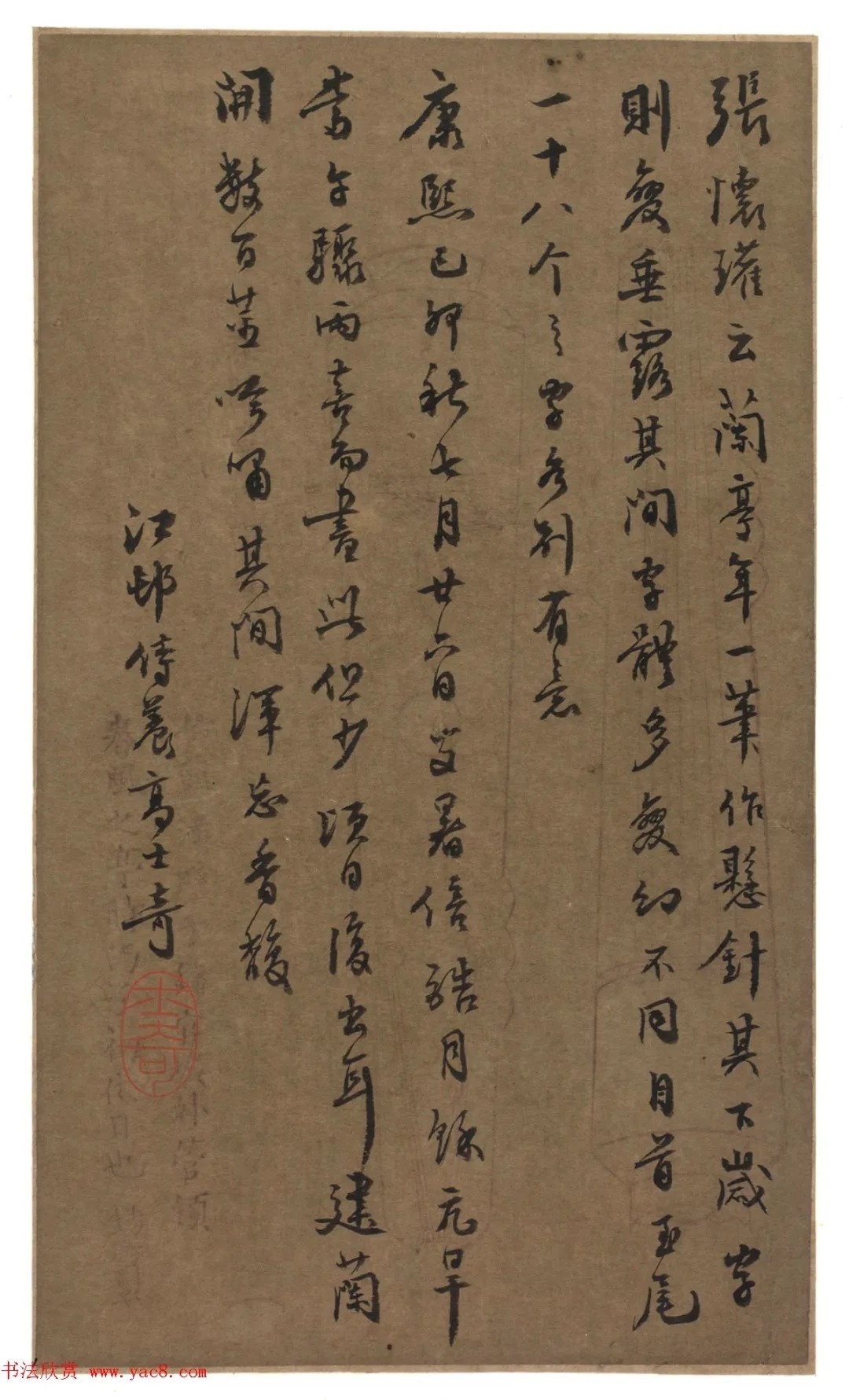 此篇书《张怀瓘用笔十法》之十“随字变幻”,以王羲之《兰亭序》为例,阐述笔法贵在变化。书于康熙三十八年(1699年),髙士奇时年55岁。书法纯熟悠游,婉转流媚,为江村晚年精美小品。