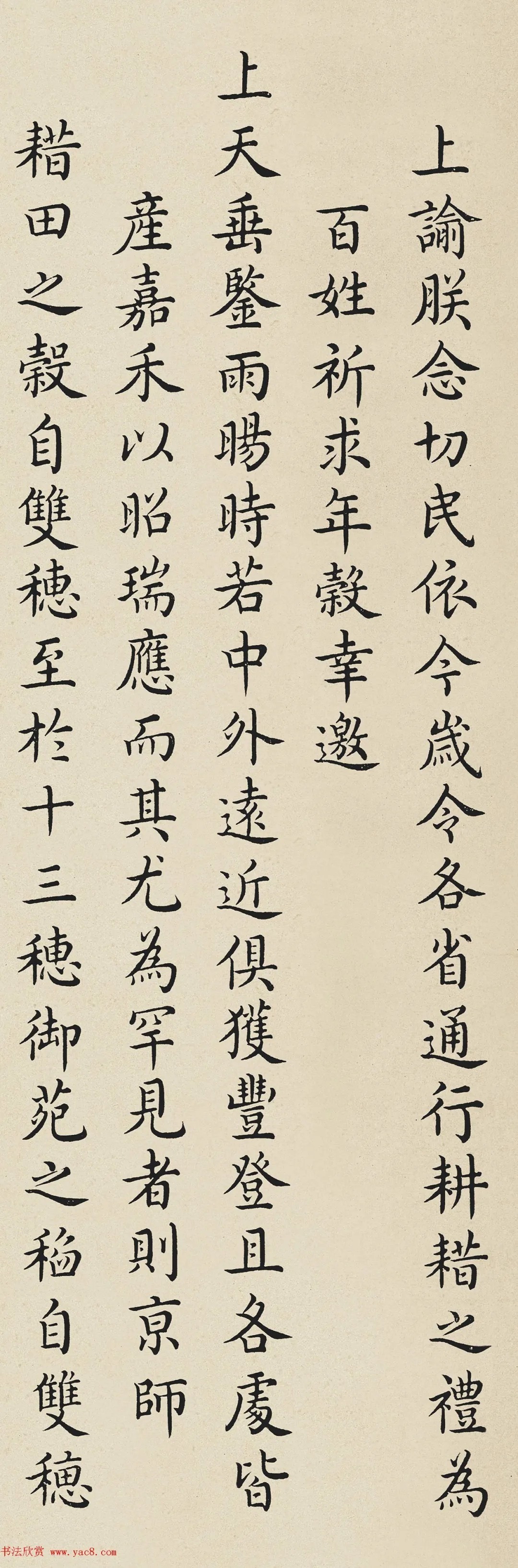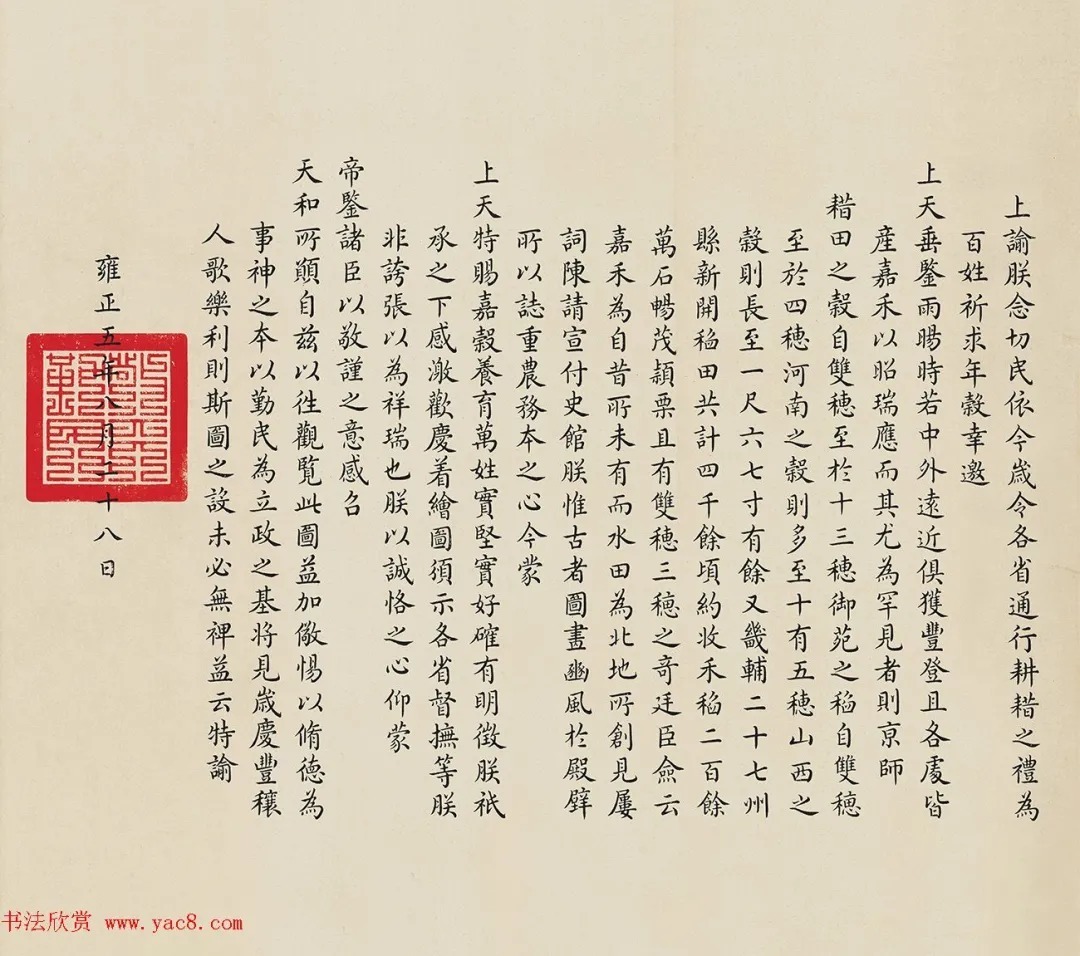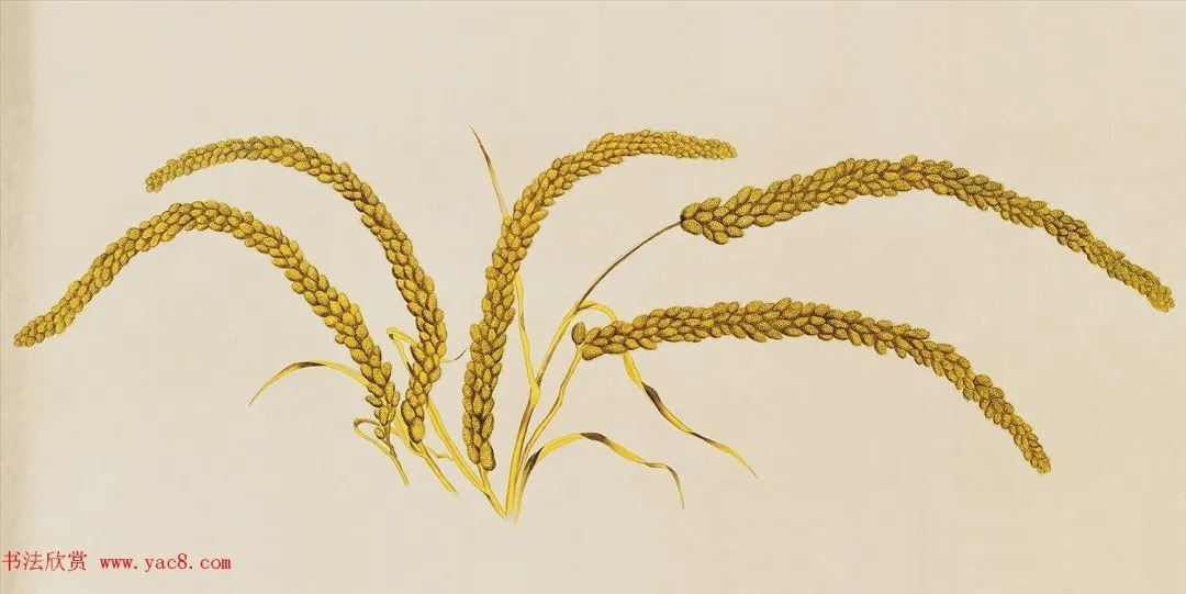 中国古代视瑞谷嘉禾为吉祥的征兆,历代帝王多喜命宫廷画师绘瑞谷图。此图绘于雍正五年,绘金色瑞谷五穗,穗长且颗颗饱满,寓意五谷丰登。画右侧有雍正帝的下诣诏书,可见帝王对农业的重视。