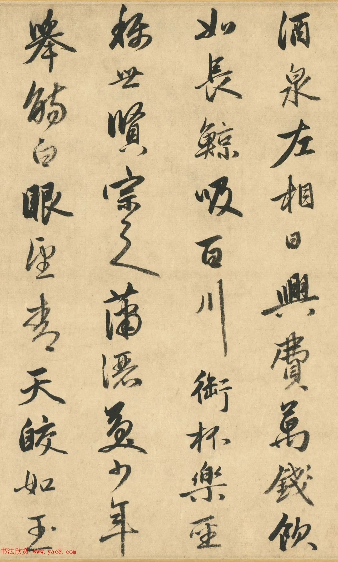 知章骑马似乘船,眼花落井水底眠。汝阳三斗始朝天,道逢麴车口流涎,恨不移封向酒泉。左相日兴费万钱,饮如长鲸吸百川,衔杯乐圣称世贤。宗之潇洒美少年,举觞白眼望青天,皎如玉树临风前。苏晋长斋绣佛前,醉中往往爱逃禅。李白一斗诗百篇,长安市上酒家暝。天子呼来不上船,自称臣是酒中仙。张旭三杯草圣传,脱帽露顶王公前,挥毫落纸如云烟。焦遂五斗方卓然,高谈雄辩惊四筵。
