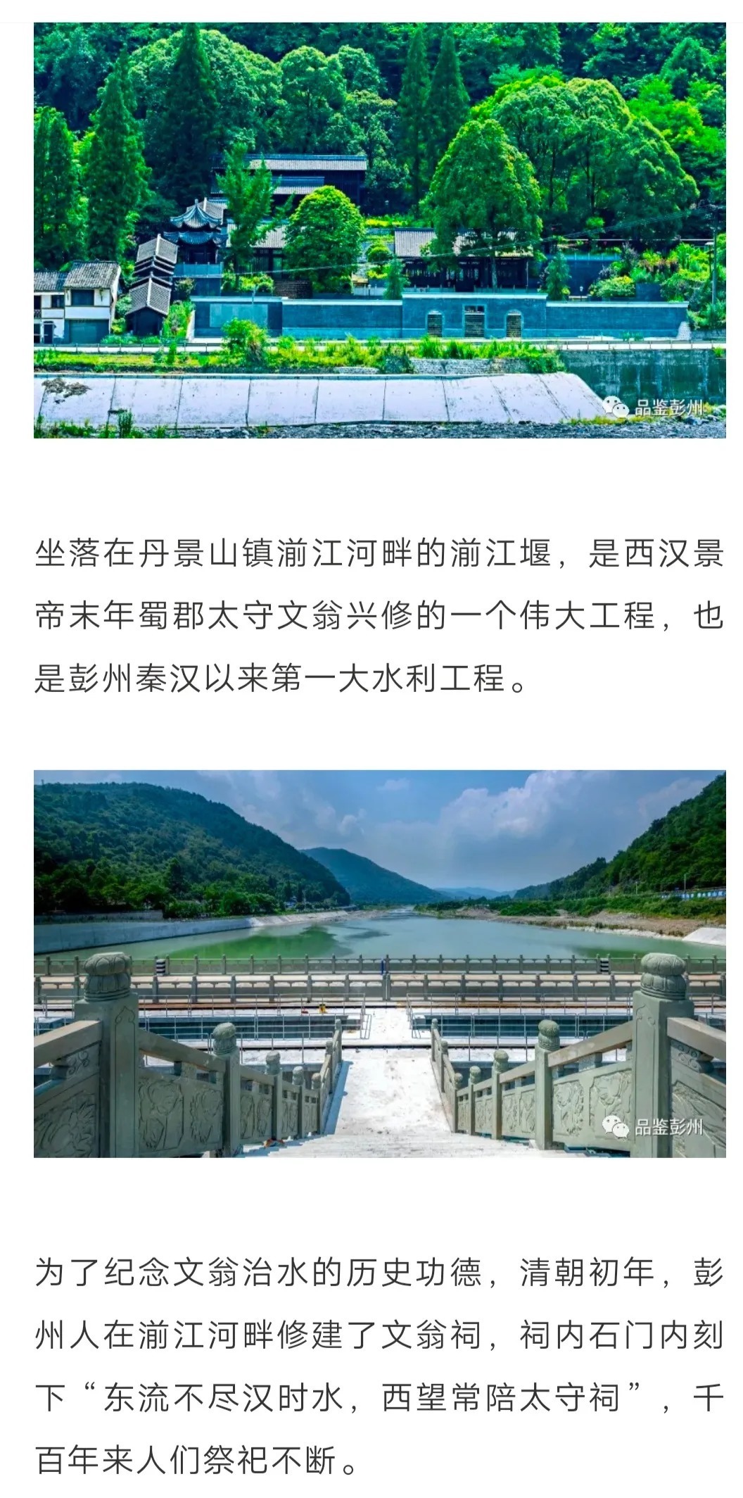 白水双龙出玉村,九溪归派汇彭门。农桑垦拓蜀王业,堰渠追思郡守魂。