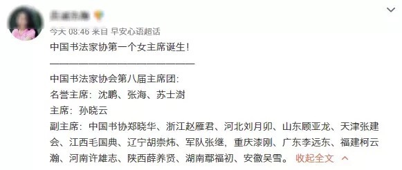 这则消息称:中国书法家协会第一个女主席诞生!同时“公布”了中国书法家协会第八届主席团名单: