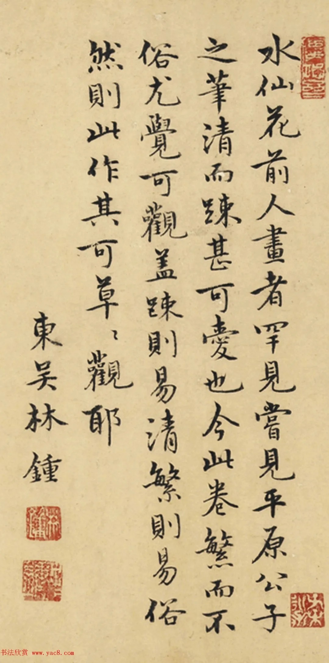 水仙花,前人画者罕见。尝见平原公子之笔,清而疎,甚可爱也。今此卷繁而不俗,尤觉可观也。盖疏则易清,繁则易俗。然则此作,其可草草观耶。东吴林钟。