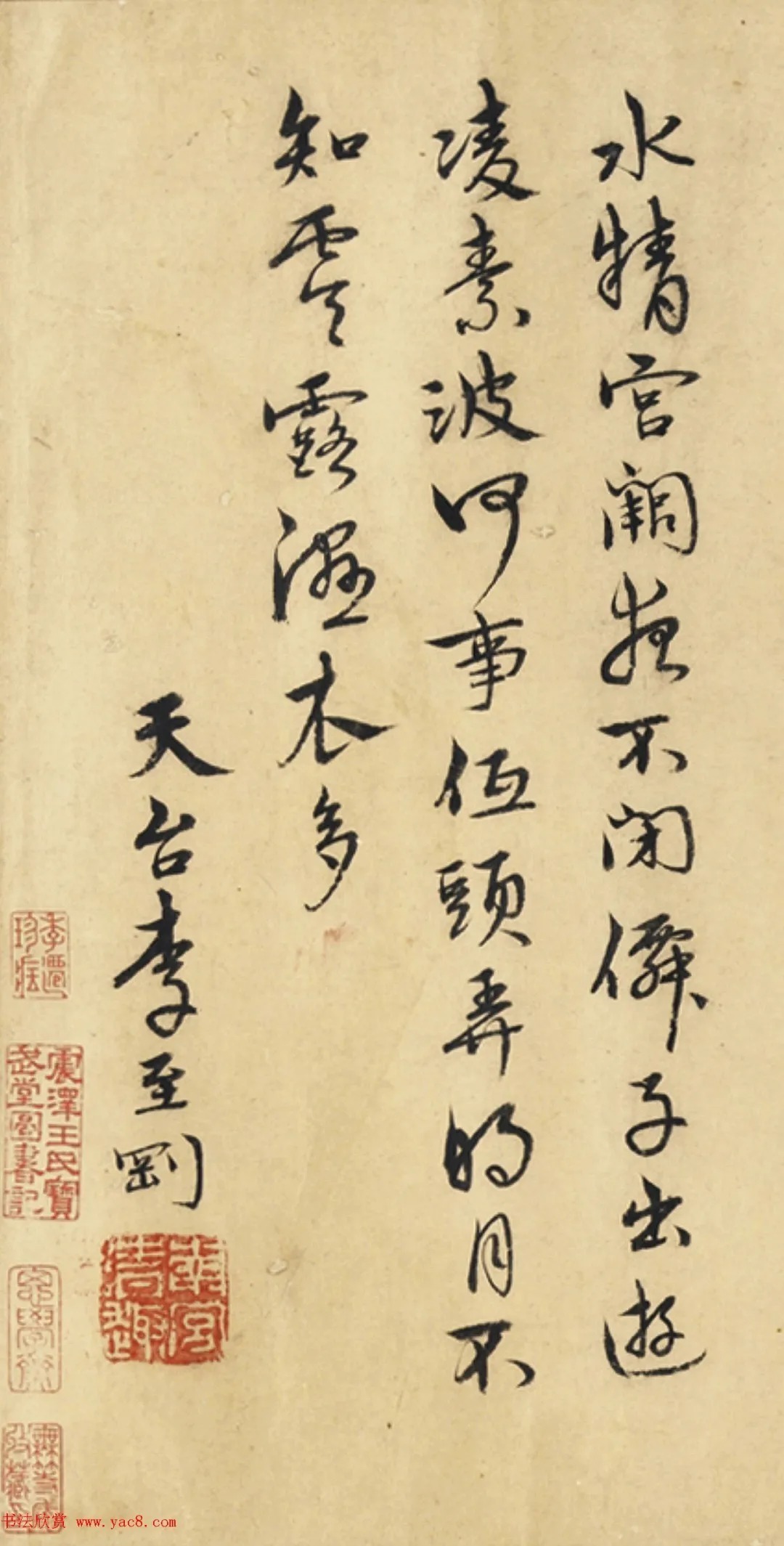 释文:水精宫阙夜不闭仙子出游凌素波何事低头弄明月不知零露湿衣多天台李至刚